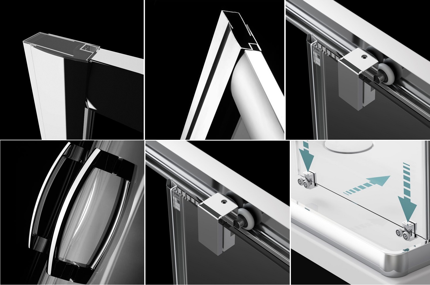 - Розсувні двері, виготовлені із загартованого скла товщиною 5 мм (тверді деталі) та 6 мм (рухомі частини) на підшипниках у хромованих корпусах < /li>