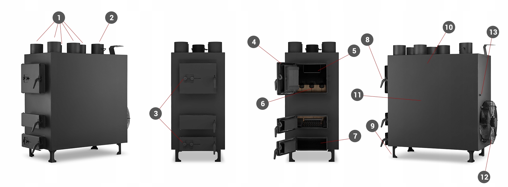 1. 5 x Outlet Hot Air Ø 150 мм/ 2. 11. Велика камера згоряння/ 12. осьовий вентилятор накачування/ 13. отвір для датчика температури