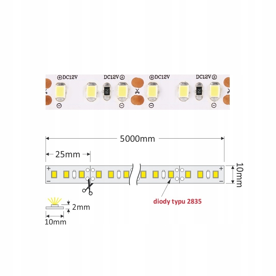 Premium Class - це абсолютно нова якість світлодіодних стрічок. Розроблений для найвибагливіших клієнтів, він характеризується високою якістю індивідуальних елементів та суцільним підшерстяючим друком. Завдяки цьому стрічка буде впоратися навіть у найскладніших умовах праці. Сучасні світлодіоди забезпечують на 100% більше світла, ніж традиційні стрічки з однаковим споживанням електроенергії! м). Один стрічковий модуль завдовжки 2,5 см і містить 3 сучасні світлодіоди 2835. Стрічка можна вирізати кожні 2,5 см до ділянок будь -якої довжини.