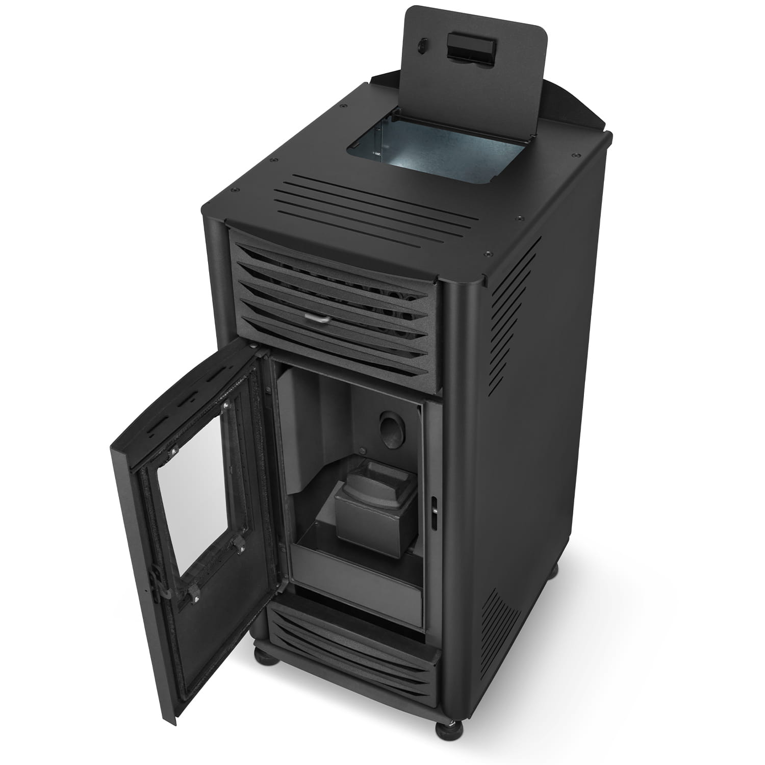 - Дизайн печі забезпечує вільний доступ для легкого очищення та видалення золи, якої залишається дуже мало після спалювання пелет