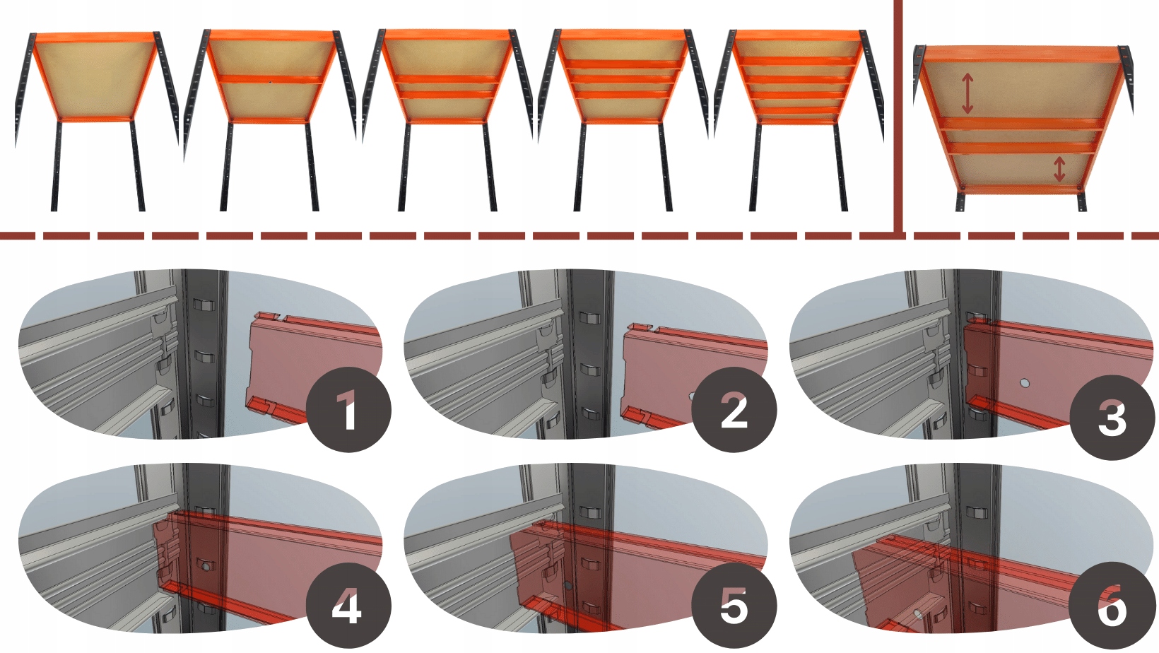 Підсилення, що визначають вантажопідйомність полиці, вибирайте відповідно до ваших потреб. Пам'ятайте, що ви можете вільно розміщувати підсилення під полицею, переміщати їх і пристосовувати до товарів, які ви на ній розміщуєте. Однак завантажуйте полицю рівномірно, щоб збільшити її несучу здатність.