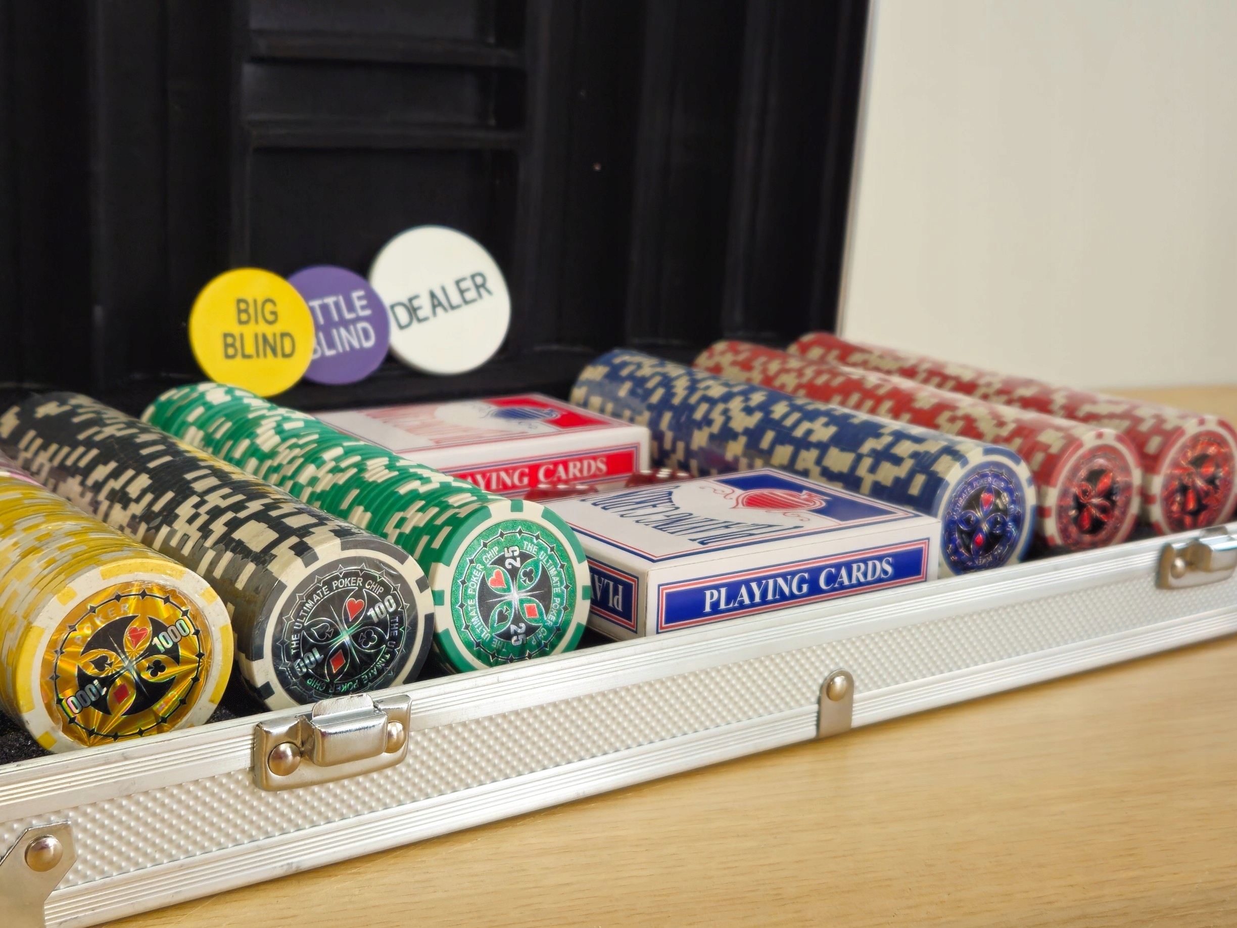фішки для покеру: до 300 штук професійних фішок для покеру, кожна з яких має металевий диск всередині, тому вони міцні та точно збалансовані. Жетони мають елегантну обробку та гарний блиск. Висока якість жетонів гарантує гравцеві унікальне зчеплення та неймовірні враження від гри