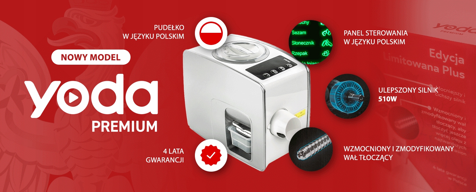 Олійниця Yoda Premium - це нова преса 3-го покоління plus з польськими субтитрами та повним польським меню. Тепер працювати буде ще зручніше, ніж раніше. Yoda Premium є вдосконаленою версією Yoda press plus третього покоління (технічний номер YD-ZY-02A). Це домашній прес для олії холодного віджиму (олія холодного віджиму містить набагато більше інгредієнтів, таких як Омега 3, 6, 9 або вітамінів) з олійних культур. Yoda Premium – це модернізована Gen. II: