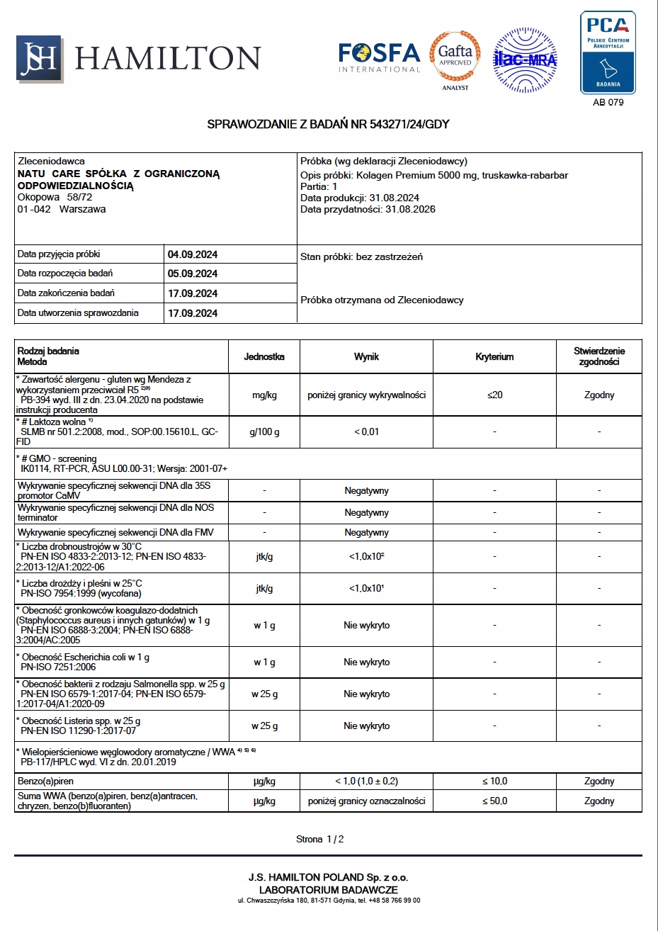 Продукція Natu.Care перевіряється акредитованою лабораторією J.S. Hamilton Poland. Склад Premium Collagen (як і всі інші продукти) пройшов мікробіологічні дослідження, в тому числі на наявність ГМО, ПАУ, лактози, глютену та важких металів.
