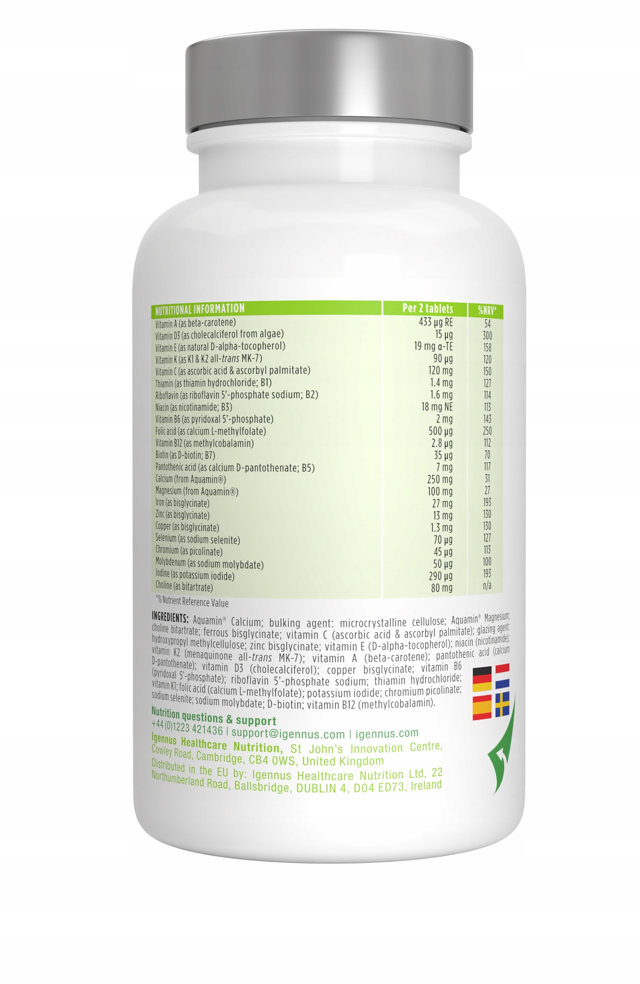 Інгредієнти: Aquamin® морські водорості (Lithothamnion sp.); наповнювач: целюлоза мікрокристалічна; вітамін С; холін; емульгатор: гідроксипропілметилцелюлоза; залізо; Вітамін Е; ніацин; цинк; пантотенова кислота; вітамін B6; рибофлавін; тіамін;мідь; фолієва кислота (L-метилфолат кальцію); вітамін А (бета-каротин); йод; вітамін К (66% К1 і 33% К2 МК-7); селен; молібден; хром; біотин; вітамін D3 (холекальциферол з водоростей); вітамін B12 (метилкобаламін).