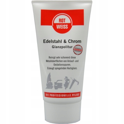 Засіб ROTWEISS для глянцевого полірування нержавіючої сталі та хрому підходить для полірування та видалення слідів зношення, а також для м’якого видалення слідів окислення та потьмяніння на металевих поверхнях.