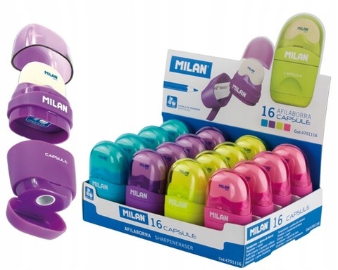 Чудова комбінація точилки та гумки в одному. З одного боку є одинарна точилка для тонких крейди та олівців. З іншого боку м'яка гумка з синтетичного каучуку, а посередині контейнер для шматків. Вони мають гострі та міцні леза з вуглецевої сталі, що робить їх ідеальними для всіх типів олівців. Вони мають захисну систему лез, яка запобігає від’єднанню леза від корпусу точила. Ідеально підходить для використання в школі. В наявності 4 кольори: синій, фіолетовий, рожевий і зелений. Оригінальний продукт, створений власним відділом досліджень і розробок MILAN. Розмір точила та гумки: 6,5 x 3,5 x 2,4 см.