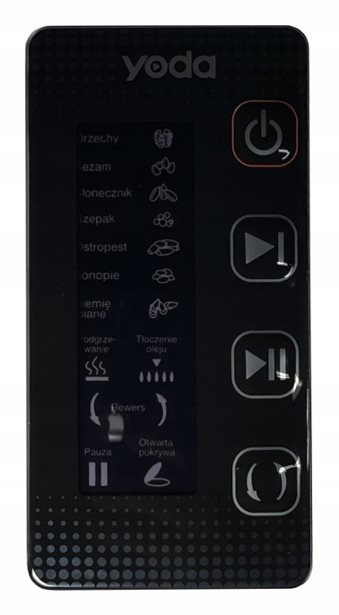 Видавлювач олії Yoda по-дитячому простий у використанні - за допомогою кількох кнопок із польськими описами ми вибираємо, що хочемо натиснути. Потім заливаємо матеріал в апарат і включаємо його. Прес має сім програм для різних видів сировини: арахісу, кунжуту, соняшнику, ріпаку, насіння льону, волоських горіхів і останню додаткову програму для сумішей і деяких інших олій. За кожною програмою ми можемо віджати багато інших подібних насіння/горіхів - докладніше про них в інструкціях.
