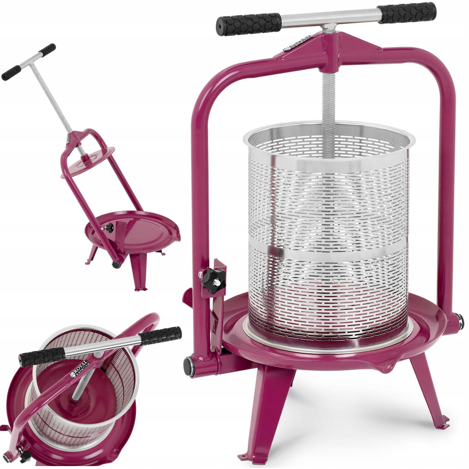 Фруктовий прес від Royal Catering забезпечить пресування винограду, яблук, груш, цитрусових, смородини тощо. Це чудовий інструмент для домашніх виробників вина та професійних виноградників. Пристрій простий у використанні завдяки гвинту, який обертається за допомогою рукоятки. Механізм тисне на подрібнені фрукти, розміщені в перфорованій ємності, і вичавлює з них сік. Потім він тече через лійку в наданий резервуар (не входить в комплект). Висока стійкість фруктового преса досягається завдяки використанню спеціальних монтажних отворів. З їх допомогою ви зможете прикрутити соковижималку до твердої поверхні.