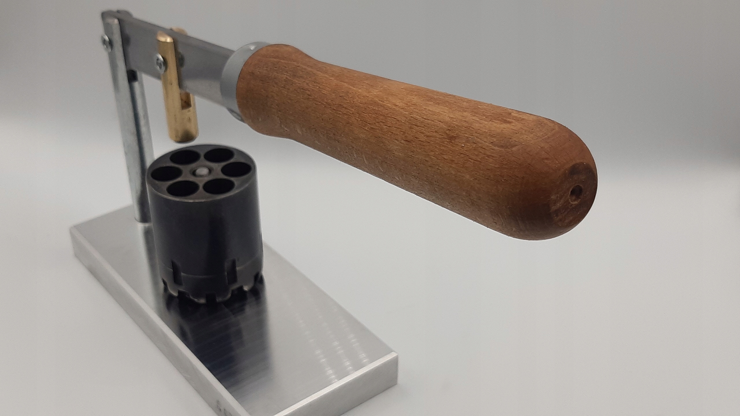Завдяки використанню преса зброя завжди завантажується однаково. Алюмінієва основа, профільована ручка з натурального дерева, інші елементи зі сталі та латуні