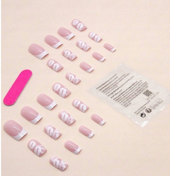У комплект входить 24 нігті 12 розмірів, наклейка (двосторонній скотч для приклеювання нігтя) і міні-пилка