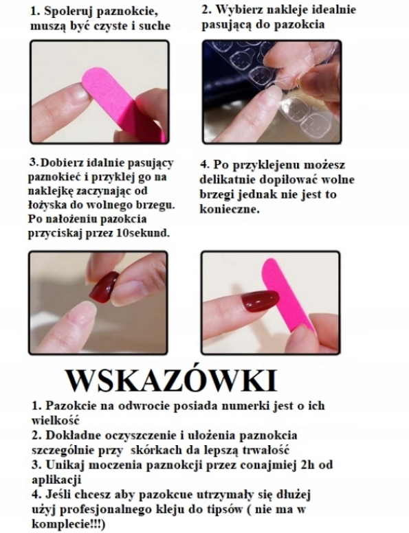 Ви також можете приклеїти свої нігті з професійним клеєм для кінчиків нігтів (не входить в комплект!!!), що подовжить їхню довговічність.