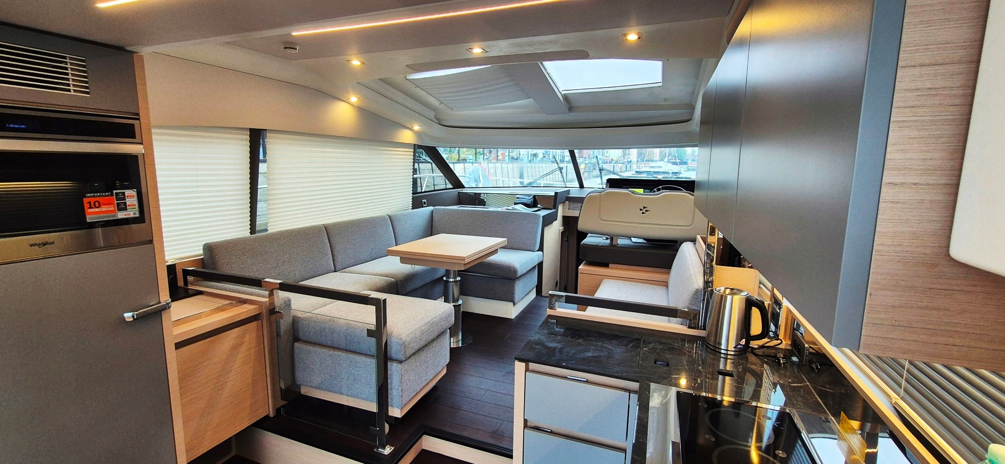 - Пакет Excellence включає - столик у кабіні з регульованою основою - кришки в кабіні - доп. защіпки на транці - управління брашпилем і лічильник ланцюга - електричне відкривання вікна правого борту в салоні - керамічна конфорка - мікрохвильова піч з грилем - система миття кокпіту прісною/солоною водою - підключення до води з причалу