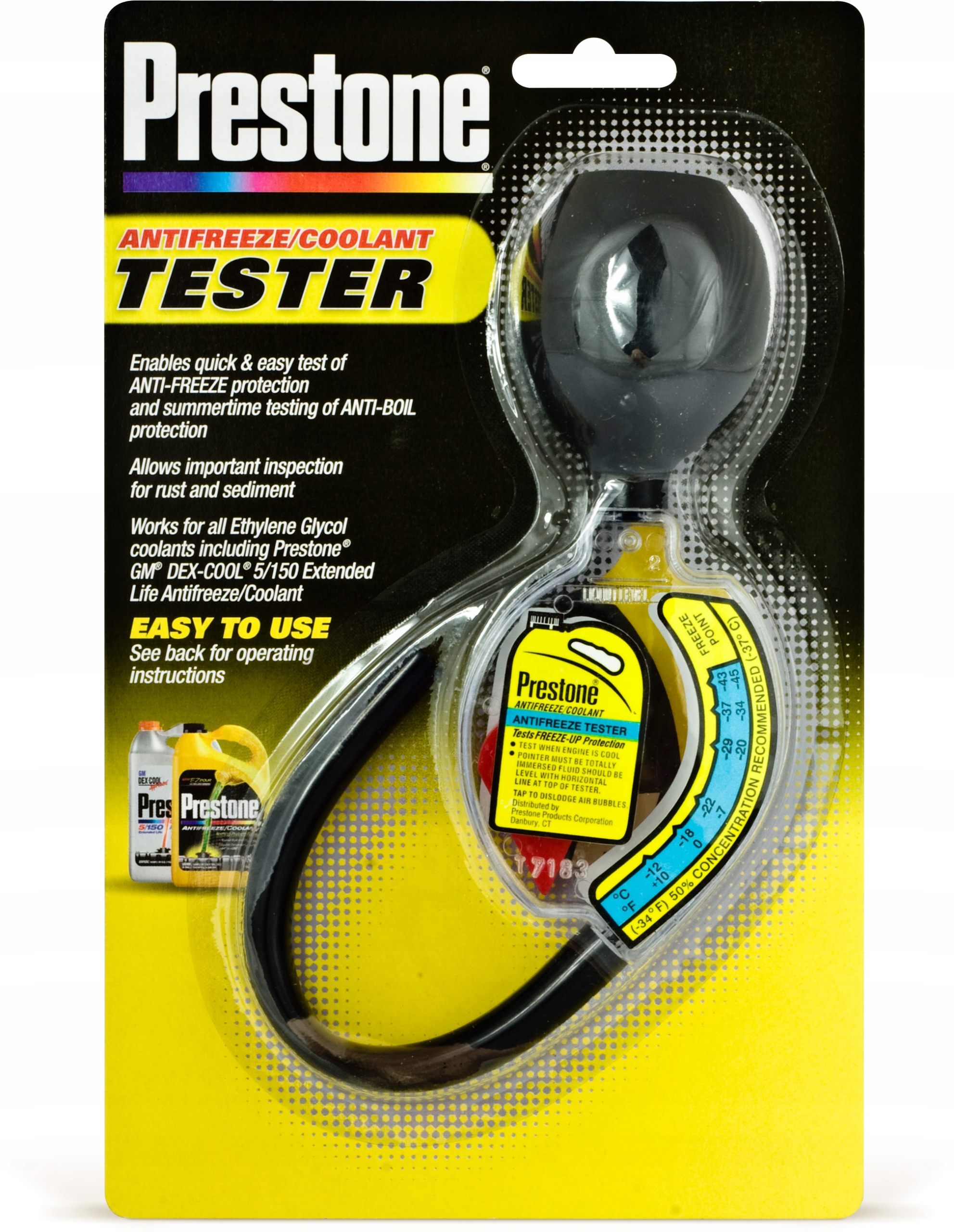 Тестер Prestone дозволяє точно перевірити параметри охолоджувальної рідини протягом кількох секунд. З його допомогою ми можемо визначити температури замерзання і кипіння теплоносія. Прозорий резервуар дозволяє перевірити чистоту рідини, що дозволяє швидко реагувати при виявленні будь-яких порушень (наприклад, занадто висока температура замерзання рідини). Завдяки регулярним перевіркам система охолодження буде безпечною як взимку, так і влітку.