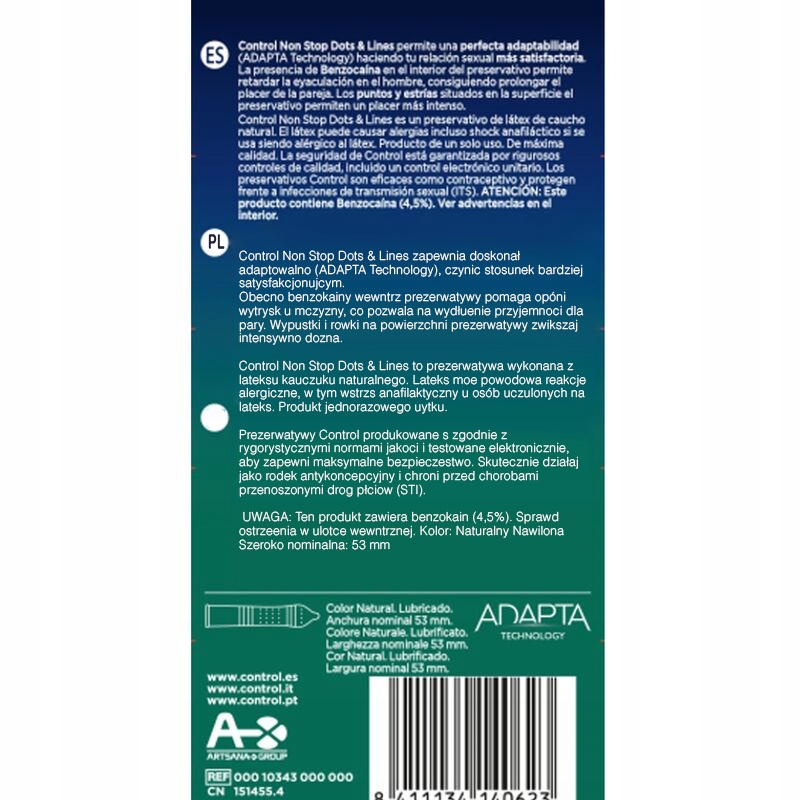 Контроль Non -Stop Dots & Lins забезпечує чудову пристосованість (технологія Adapa), що робить більш задовольняючі відносини. Наявність бензокаїну всередині презерватива допомагає затримати еякуляцію у чоловіка, що дозволяє розширити задоволення для пари. Вкладки та канавки на поверхні презерватива збільшують інтенсивність відчуттів.