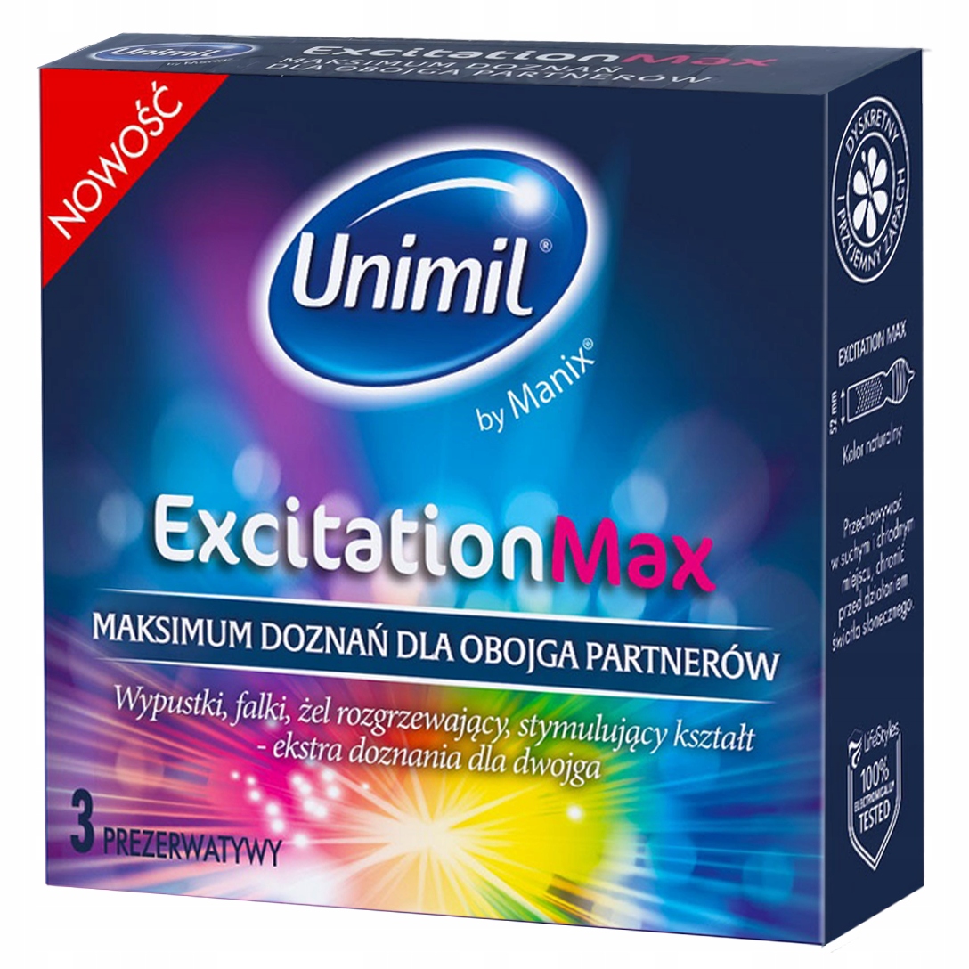 Unimil Excitation Max — презервативи, призначені для людей, які бажають підвищити інтенсивність відчуттів під час статевого акту. Спеціальна текстура з делікатними смугами та виступами стимулює обидві сторони, надаючи кожному дотику новий вимір задоволення.