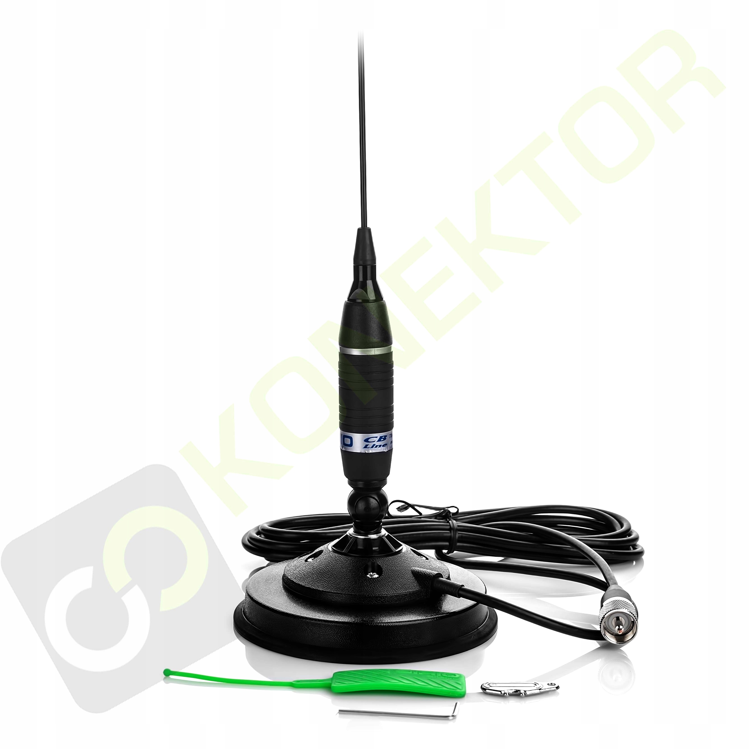 Кабель довжиною 3,60 м, встановлений у основі, завершується штекером UC-1, придатним для будь-якого CB-радіо.