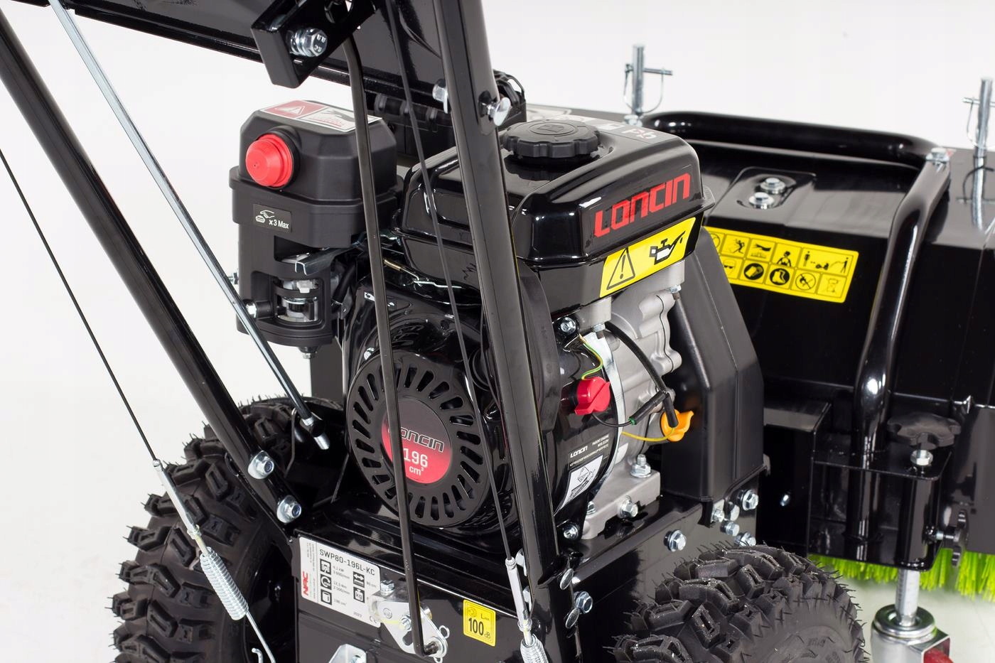 Дуже міцна, міцна підмітально-прибиральна машина з бензиновим приводом, оснащена фірмовим надійним двигуном LONCIN з номінальною потужністю до 4,1 кВт і об'ємом 196 см3. Підмітальна машина має робочу ширину до 80 см і має 5 передач вперед і 2 назад. В комплекті снігоочисник і контейнер для сміття.