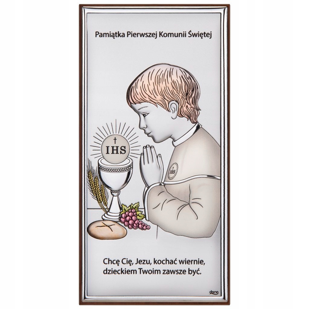 Срібна картина з написом: «Пам'ятка Першого Святого Причастя» та написом: «Я хочу любити Тебе, Ісусе, вірно, бути Твоєю дитиною завжди.» показує хлопчика, що молиться, і чашу з Гостією.