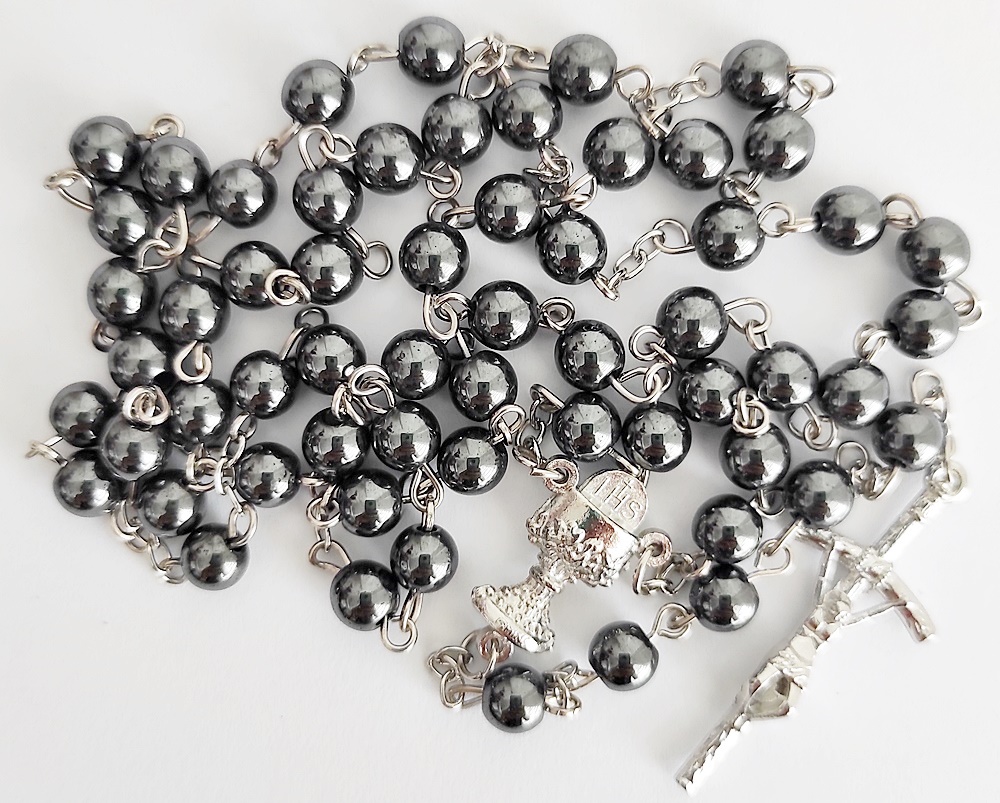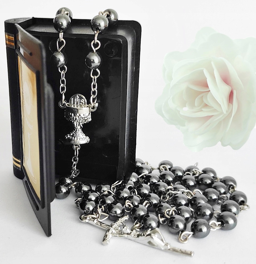 ГАРНИЙ РОЗАРІЙ ДЛЯ ПРИЧАСТЯ З НАТУРАЛЬНОГО ГЕМАТИТОВОГО КАМЕНЮ ГРАФІТОВОГО КОЛЬОРУ В КОРОБЦІ У ФОРМІ КНИГИ