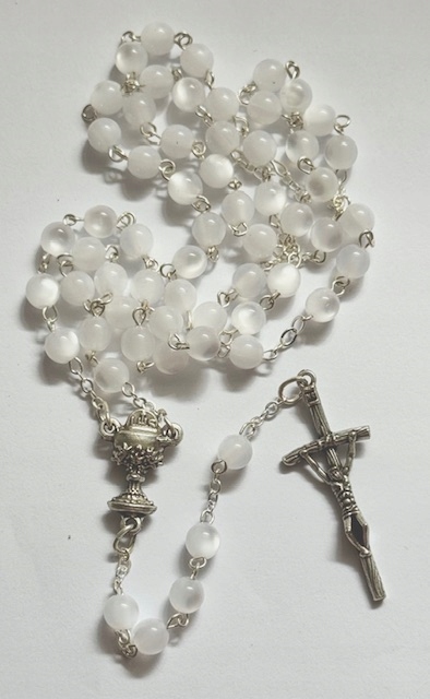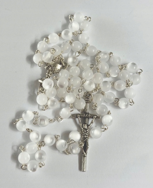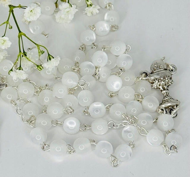 Намистини Madre perla мають ніжний, злегка перламутровий блиск, який символізує чистоту, блиск і красу Божої благодаті.