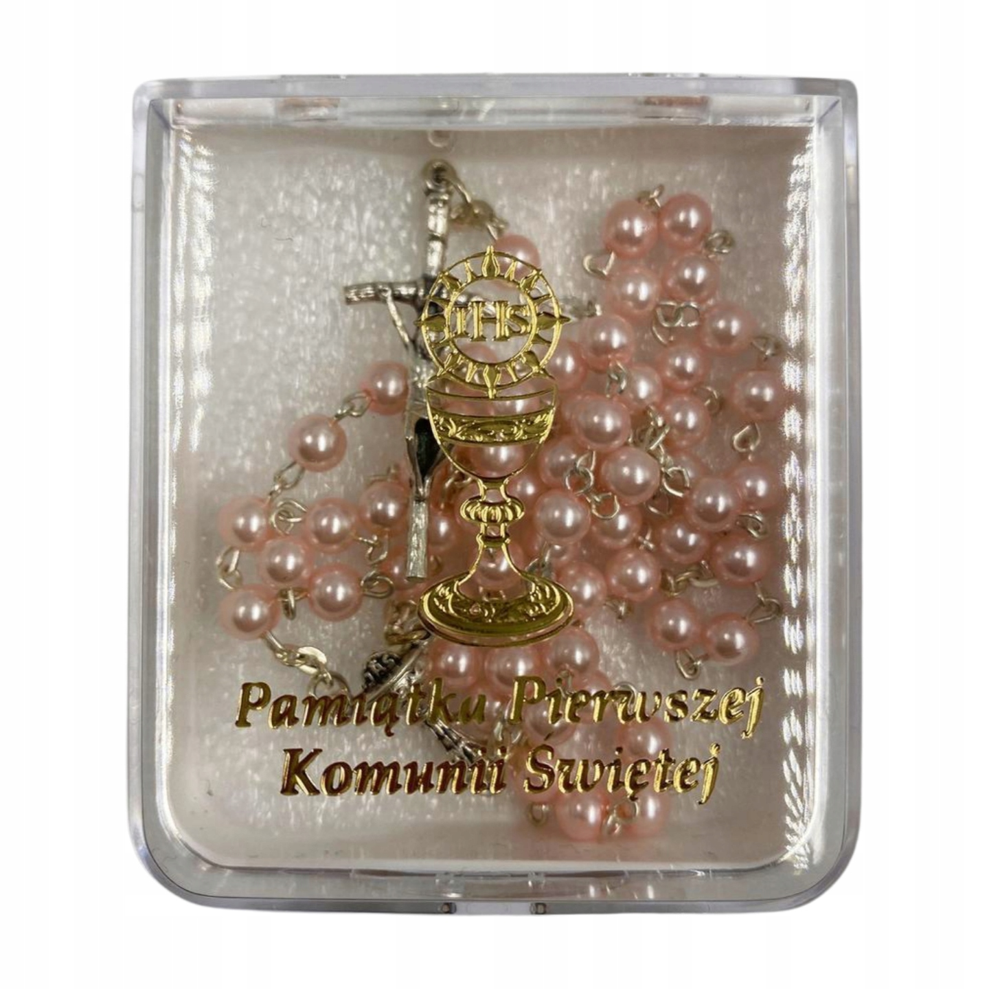 ✅ ВАРІАНТ: Розарій - РОЖЕВІ ПЕРЛИ + Коробка - СУВЕНАР ПЕРШОГО ПРИЧАСТЯ СВЯТОГО