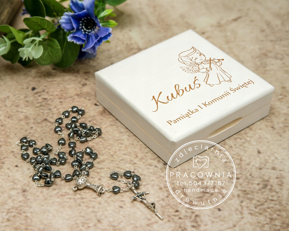 Біла дерев'яна скринька з гарною вервицею (сердечками) як сувенір до Святого Причастя. для дитини чи подяка хресним батькам чи бабусям і дідусям.