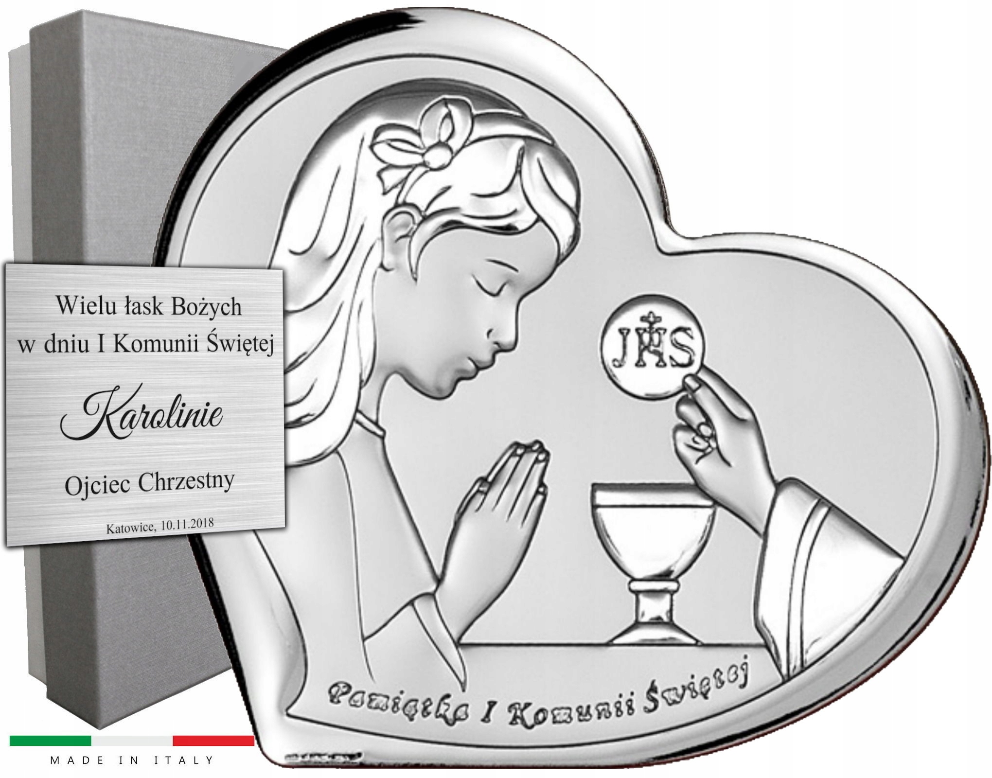 Сувенір від італійської компанії BELTRAMI із зображенням Дівчинки, яка приймає таїнство Першого Причастя . Все було закрито у формі класичного серця з написом"Сувенір Першого Святого Причастя"Картина була встановлена на коричневому лакованому дереві. Завдяки вставленій підставці картину можна розмістити на комоді або повісити на стіну.