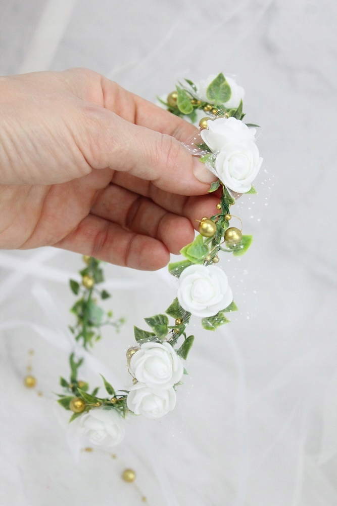 Делікатний причастяний вінок, виготовлений з троянд, загорнутих у тюль із зеленим плющем листям, форма яких нагадує серця, прикрашені золотими перлами.