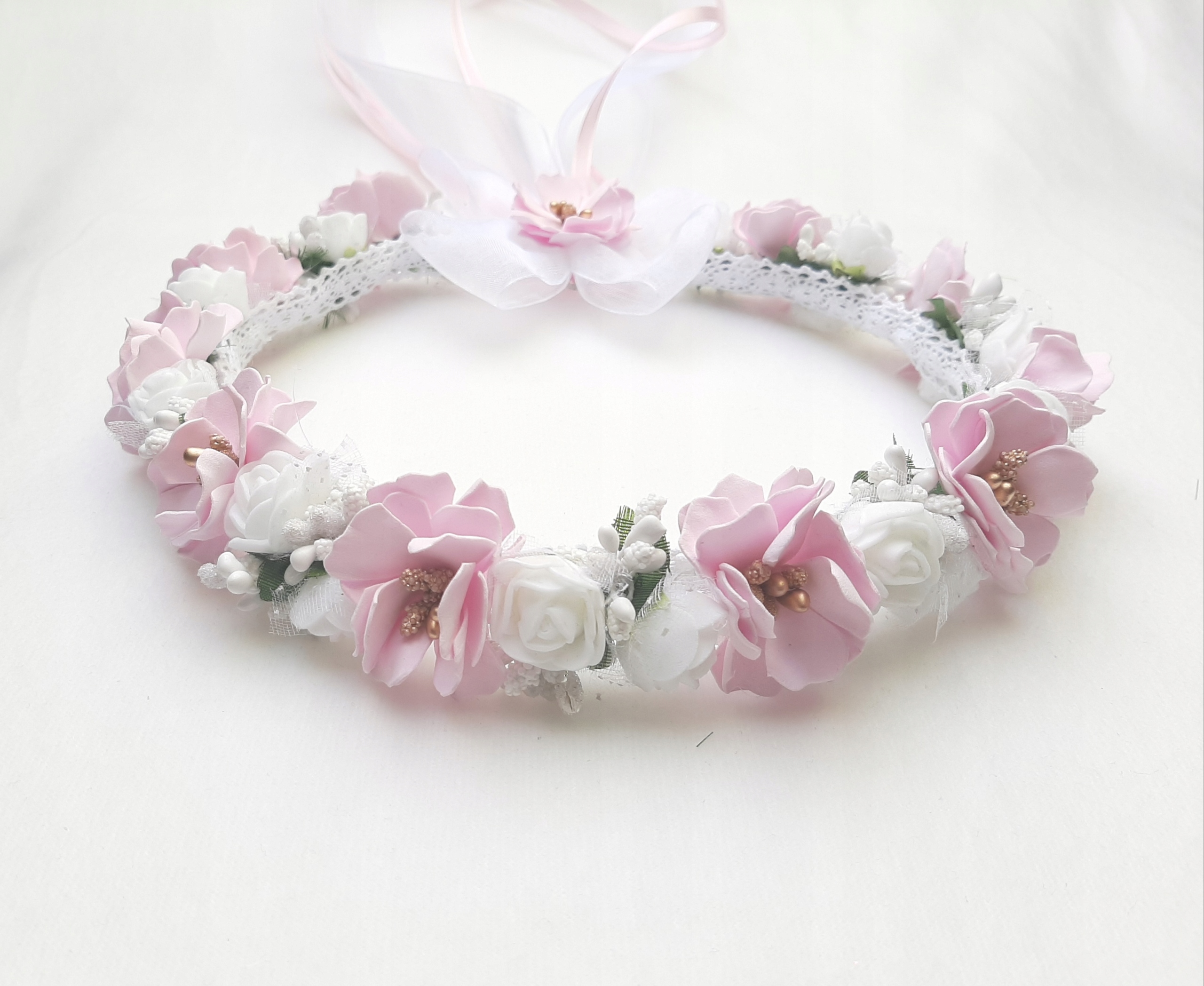 Віночок ручної роботи з квітів з пінопласту та квіткових аксесуарів. Квіти виглядають дуже реалістично, завдяки чому дівчина виглядає ніжною та елегантною в день Святого Причастя.