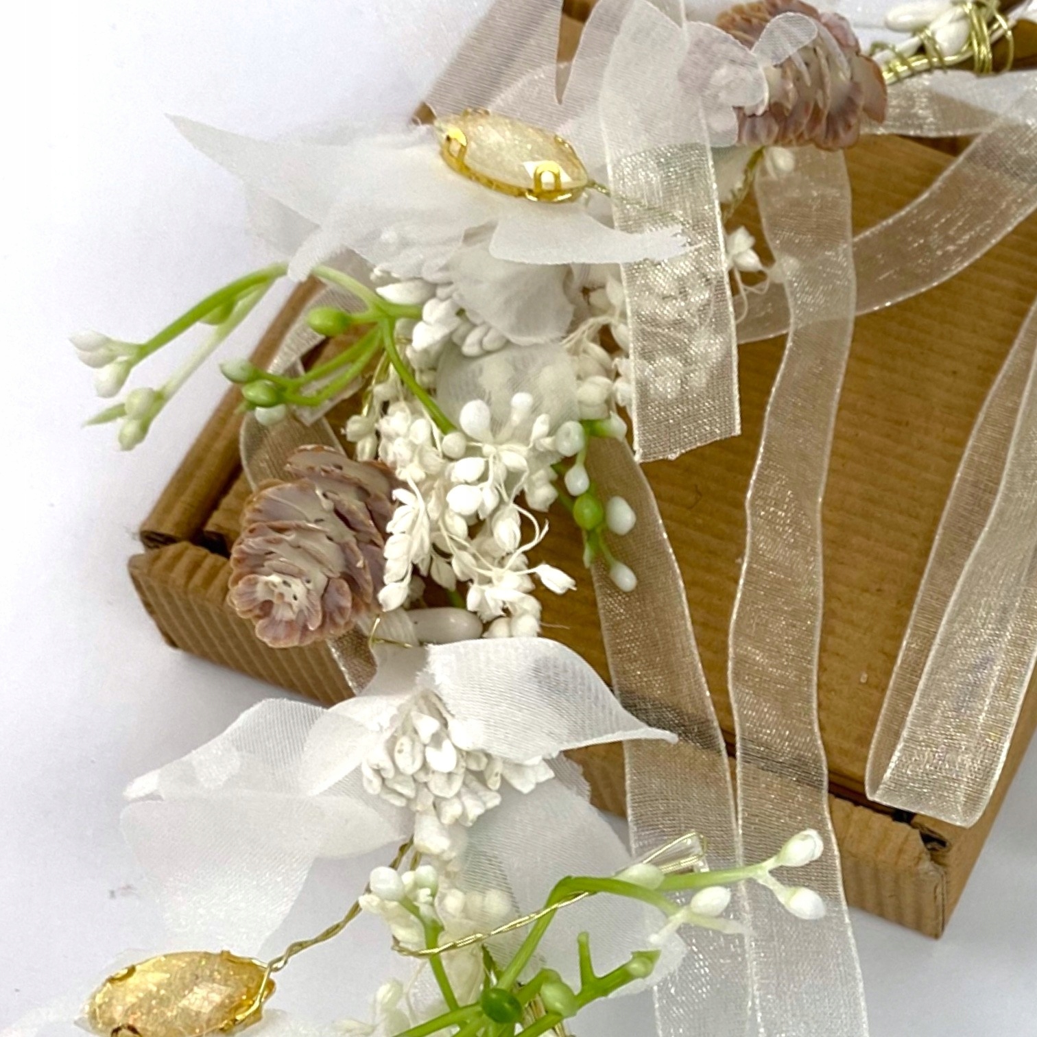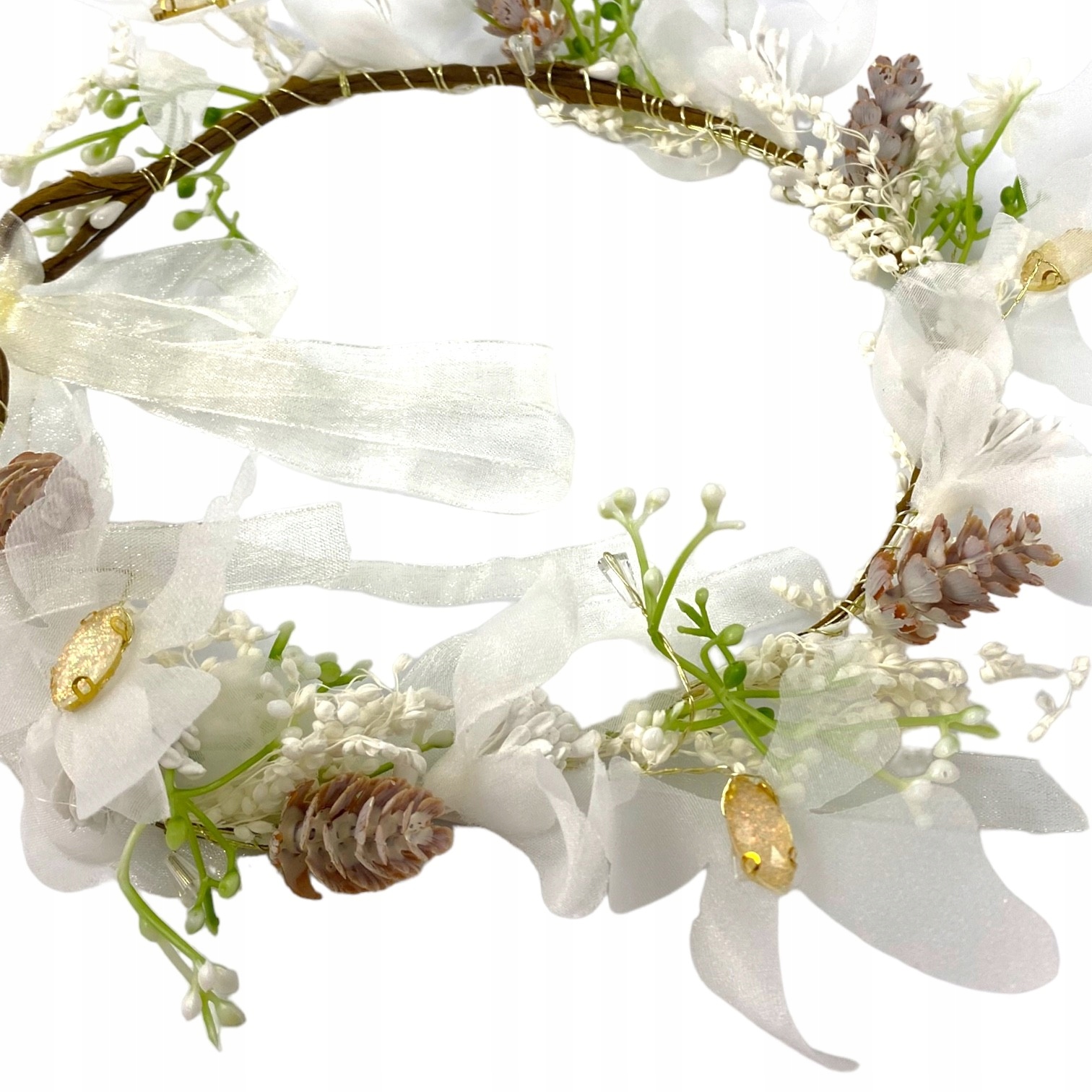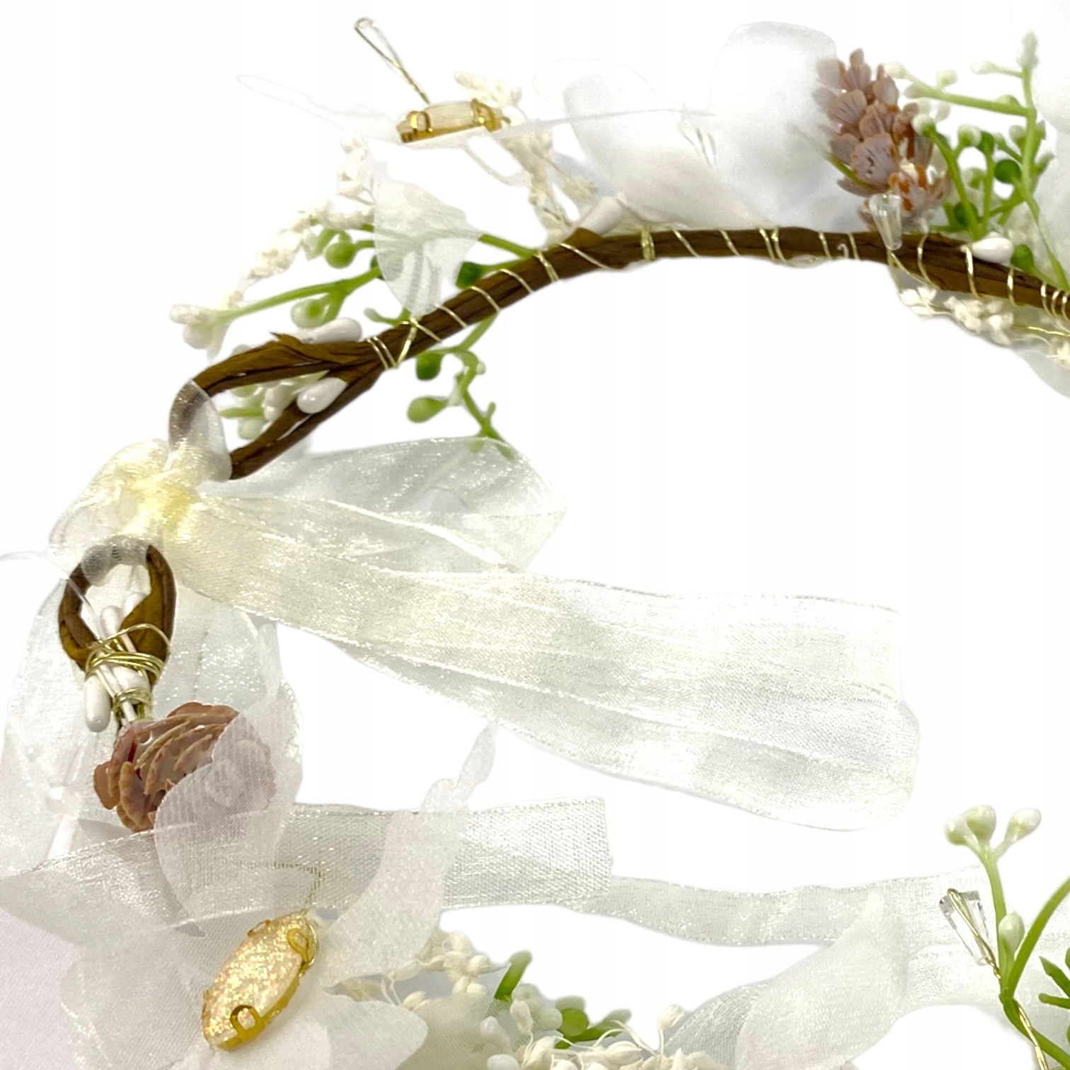 wianek upleciony Został nastrych. Для його виготовлення було використано найвищу якість. У вінку ми знайдемо як штучні квіти, так і справжні квіти, висушені методом, що не містить заморожування, завдяки якому квіти виглядають природними. Крім того, вінки були сплетені шифонові метелики з мерехтливими кристалами . Весь виглядає феноменально.