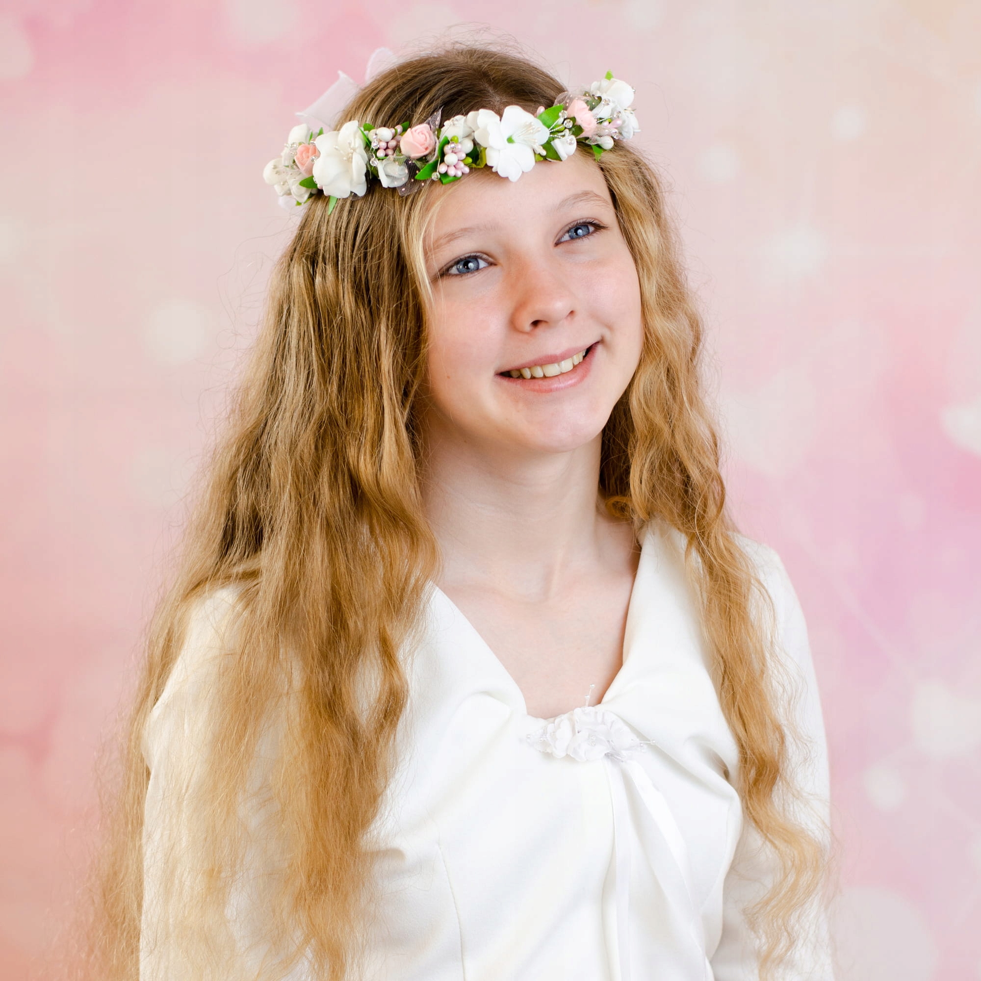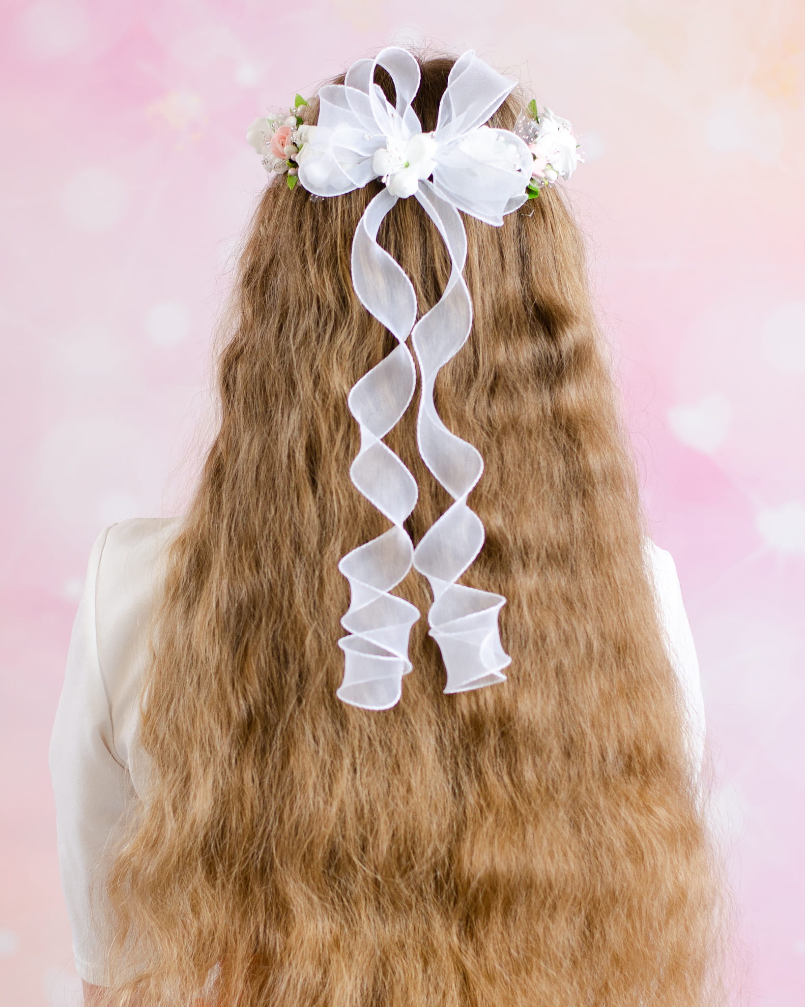 Прекрасний причастяний вінок з пінопласту рожево -білих троянд, а також зелених листя та декоративних акцентів. На спині є напівпрозорий лук. Тюльні стрічки залишають луки вниз, які прекрасно представлені на волоссі. Вінок буде ідеальним доповненням у день першого святого Причастя. Це красиво виглядає як на розчиненому, так і на зав'язаному волоссі.