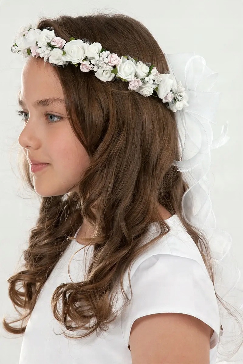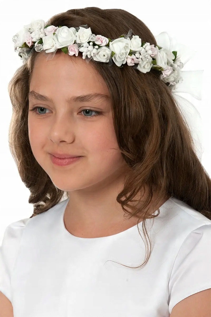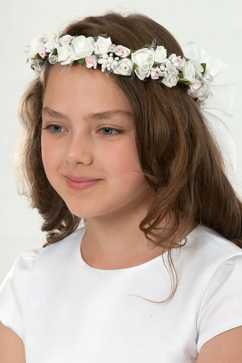 Модель вінка для причастя WK09 нашого виробництва. Ця модель виготовлена з білих пінопластових квітів, розбитих дрібними рожевими квітами, прикрашена білим гіпсом і кристалами. Вінок для причастя WK09 - одна з небагатьох моделей, яка подобається практично всім клієнтам. Віночки для причастя, представлені в нашому магазині, здебільшого власного виробництва, тому ви їх не знайдете в жодному іншому магазині.