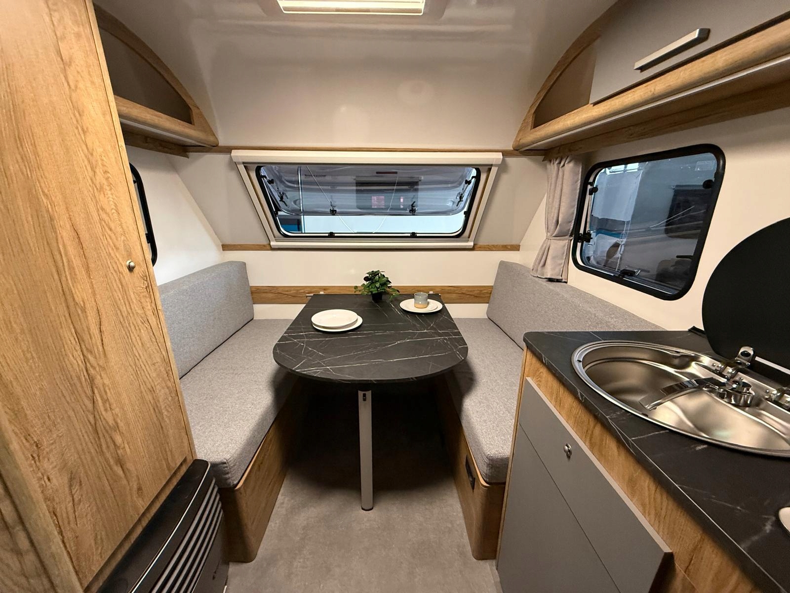 У житловій зоні причепа є стіл, який перетворюється на розкладне ліжко – ззаду є двоярусні. ліжка на 2 людини. Причіп обладнаний опаленням і ванною кімнатою з туалетом і душем з термальною ванною та душовим піддоном, а також кухонним приладдям, таким як газова плита, холодильник і раковина.