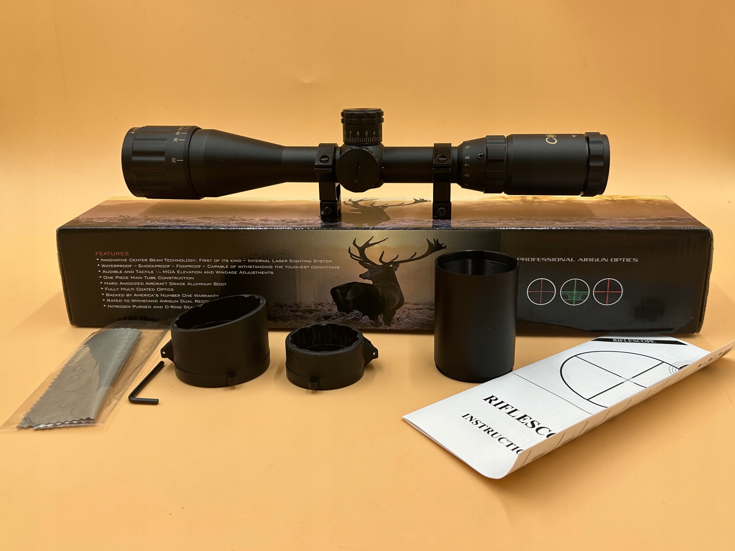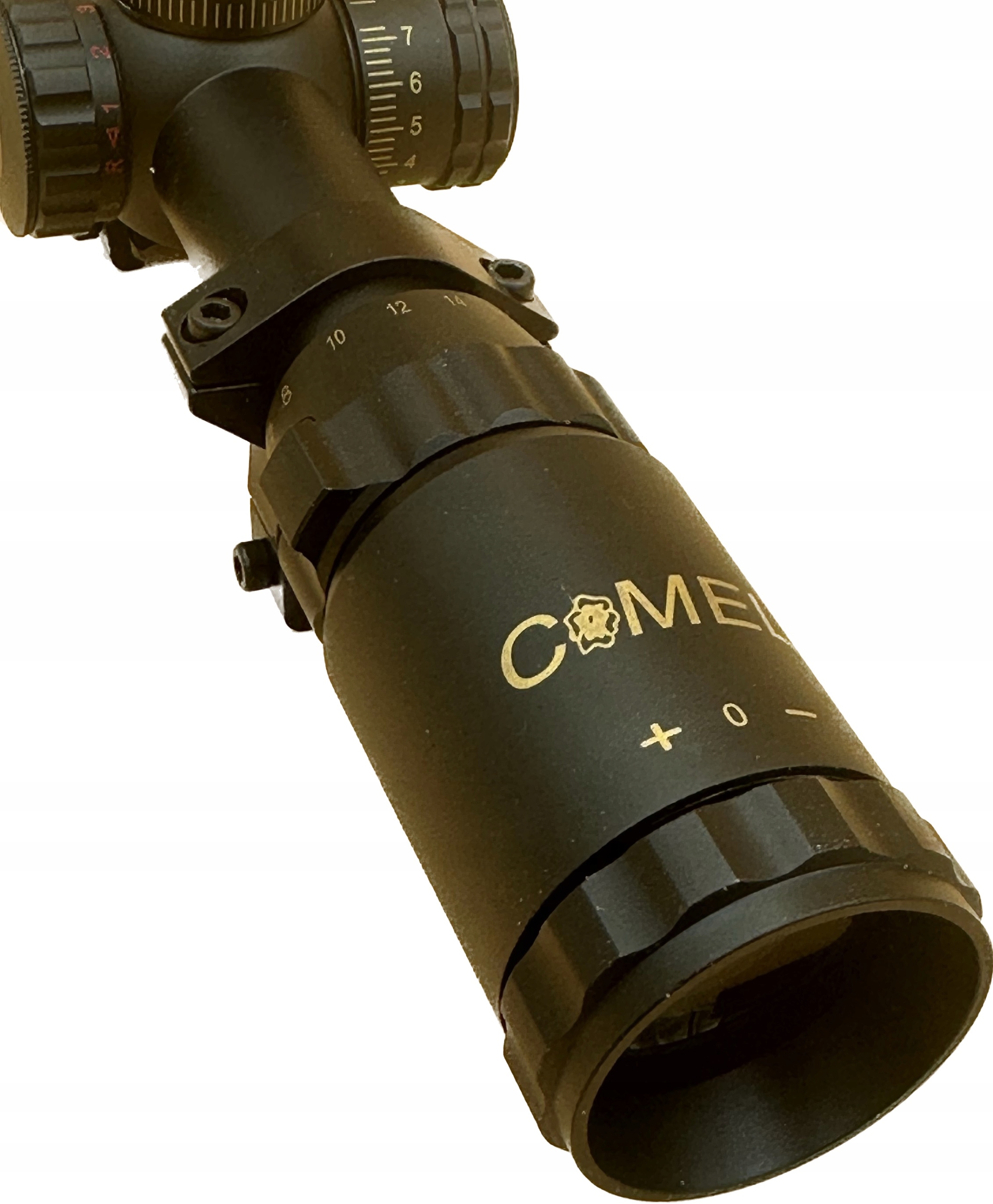 Comel 4-16x44 AOEG 35 мм - оптичний приціл, призначений для спортивної стрільби - пневматична зброя та АСГ. Він оснащений змінним збільшенням (4-16-кратне масштабування) і знімною сонцезахисною тенею. Має поперечне регулювання по вертикалі та горизонталі.
