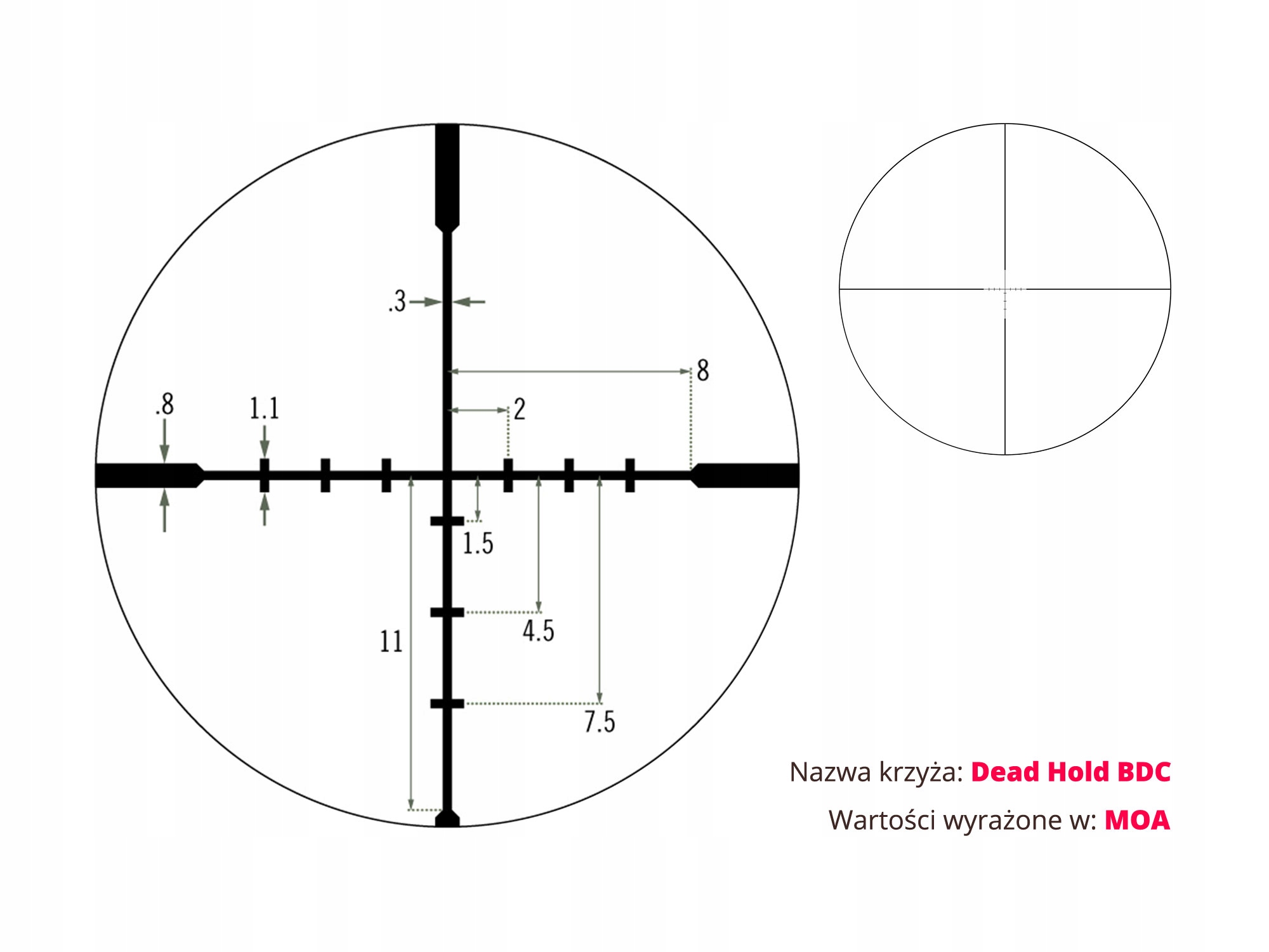 Прицільна сітка Dead-Hold BDC полегшує коригування пострілу та усуває необхідність робити наступні виправлення. Призначений для будь-якого виду стрільби чи полювання, на різних дистанціях, тобто там, де є критичною необхідність тривалого прицілювання.