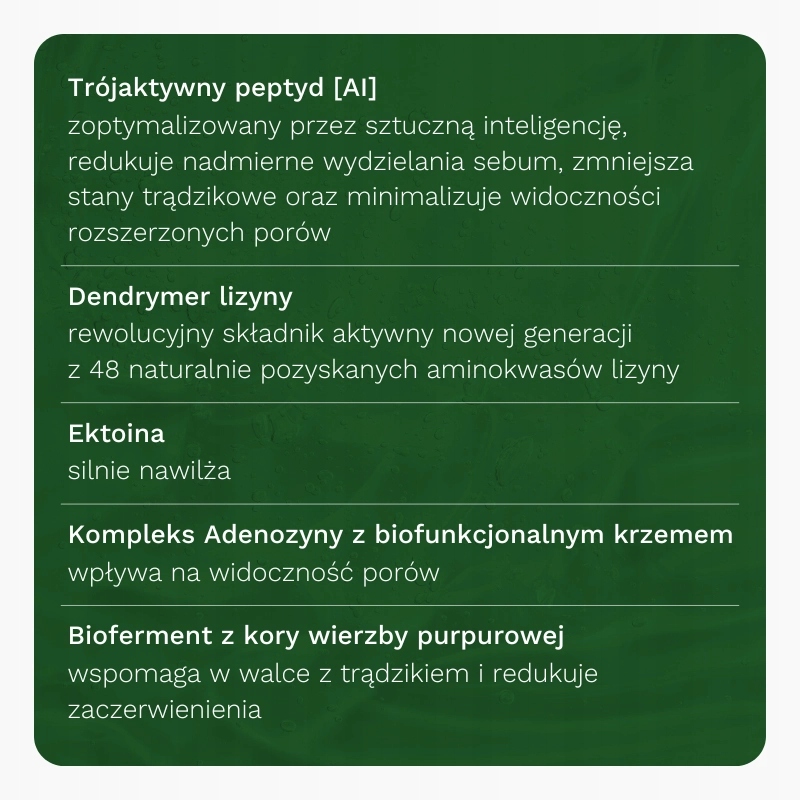 Наша проривна сироватка - це чудове рішення для шкіри прищів, що адаптується до ваших індивідуальних потреб. Використовуючи їх регулярно, ви швидко помітите, наскільки плавніше стає ваша шкіра, приглушені ураження прищів, а пори менш помітні. Попрощайтеся з недосконалостями та вітайте уніформу, сяючого обличчя! Унікальний ефект сироватки є результатом інноваційних активних інгредієнтів, які одночасно регулюють ключові механізми проблемної шкіри: вони зменшують ураження вугрів, мінімізують видимість розширених пор, зменшують надмірну секрецію сала та відновлюють баланс мікробіома шкіри. При регулярному використанні ваш колір обличчя поверне рівновагу та здоровий вигляд.