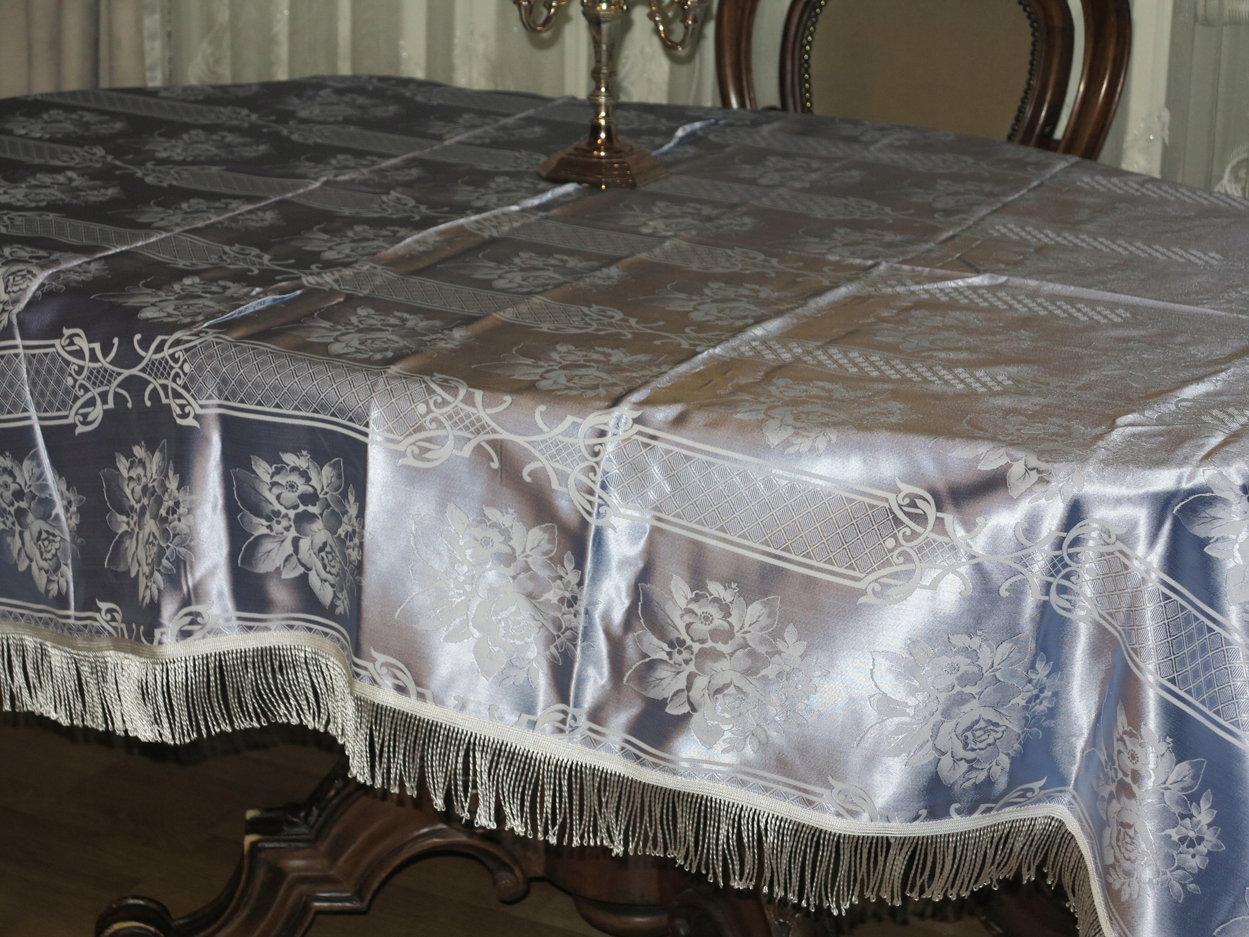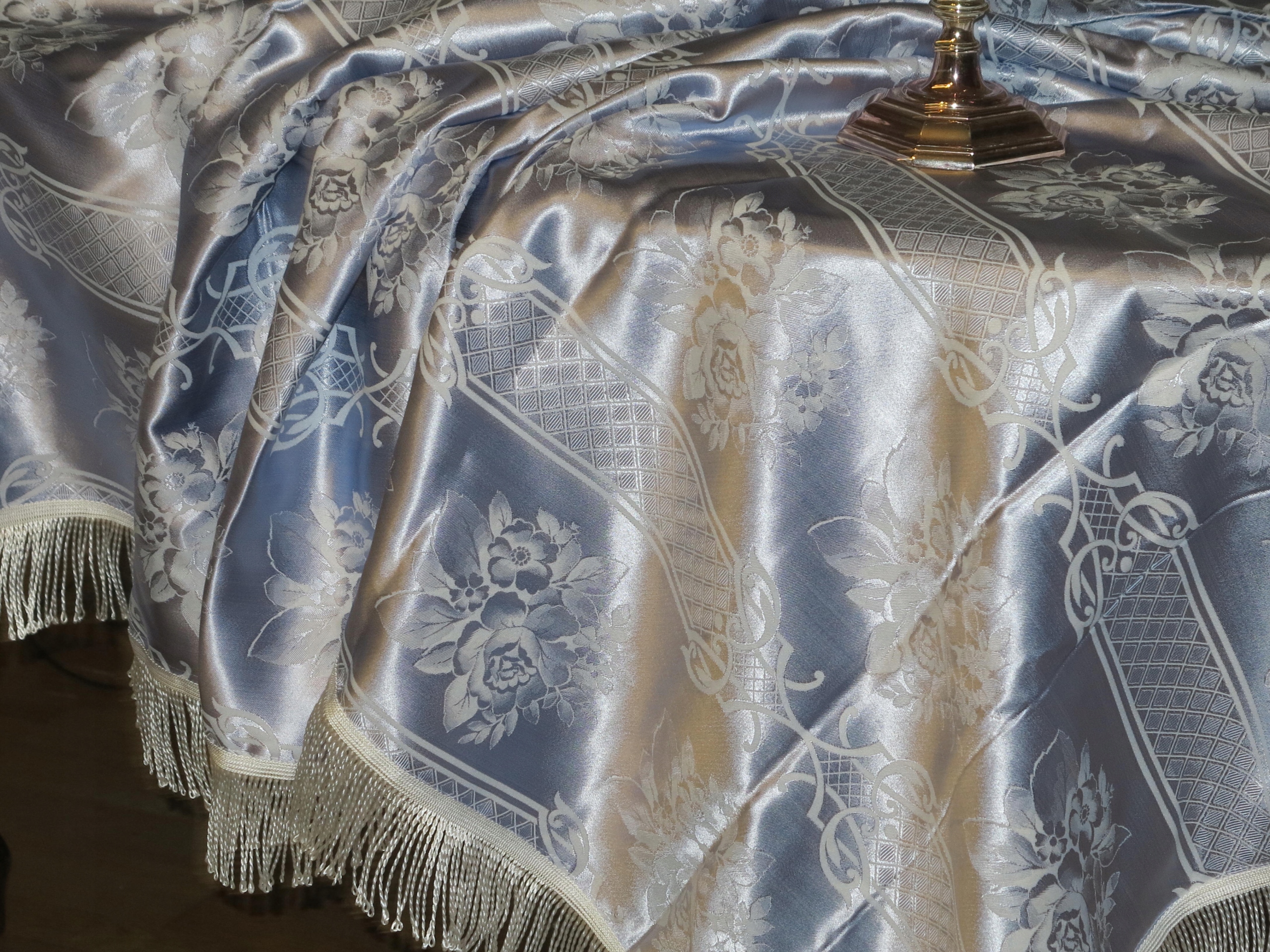 ПРИГОЛУДНА БЛАКИТНА ВЕЛИКА СКАТЕРТИНА, ШОВКОВИЙ ДАМАСК, ГУСТА БАХОРА 238/148+7