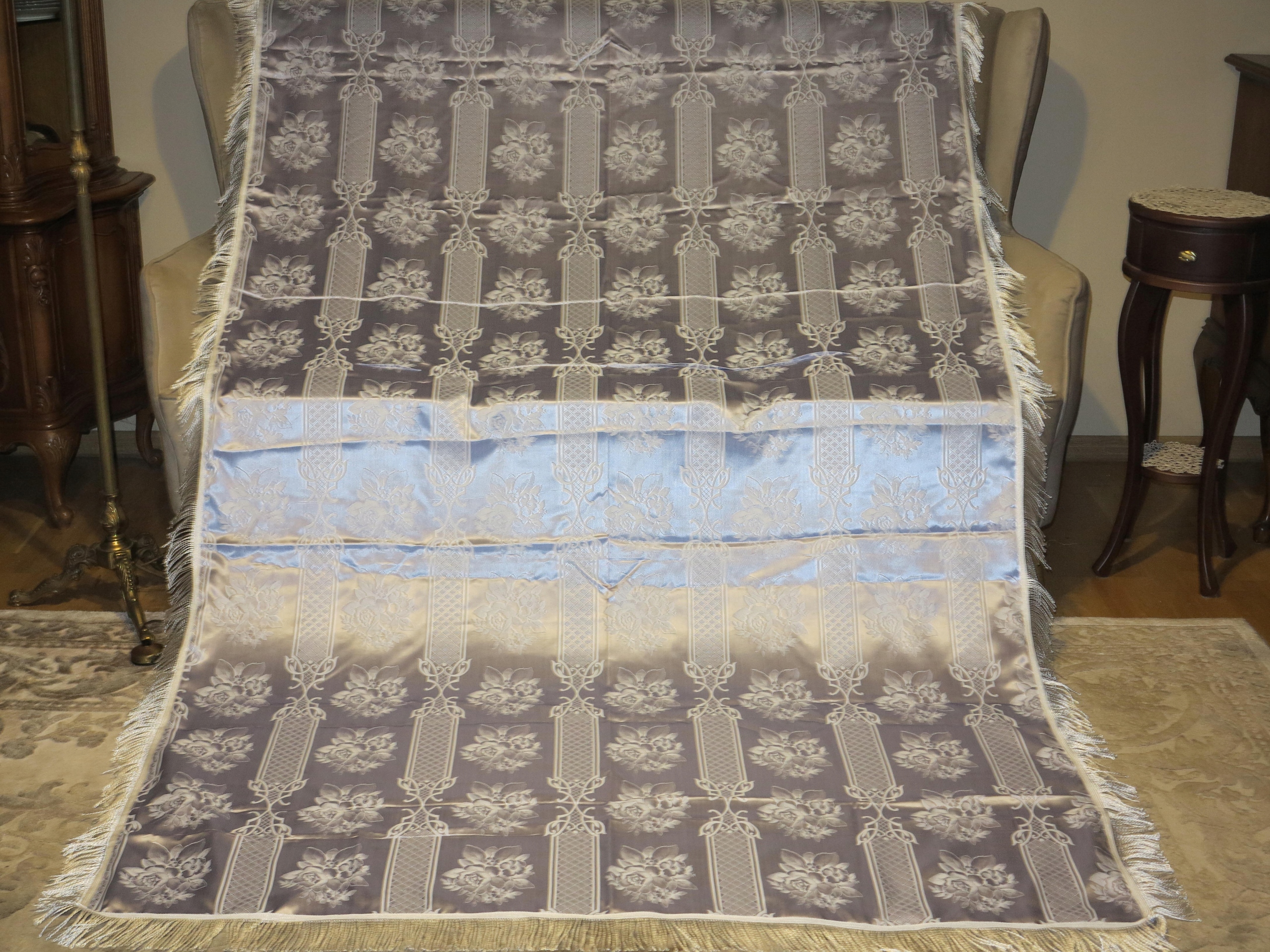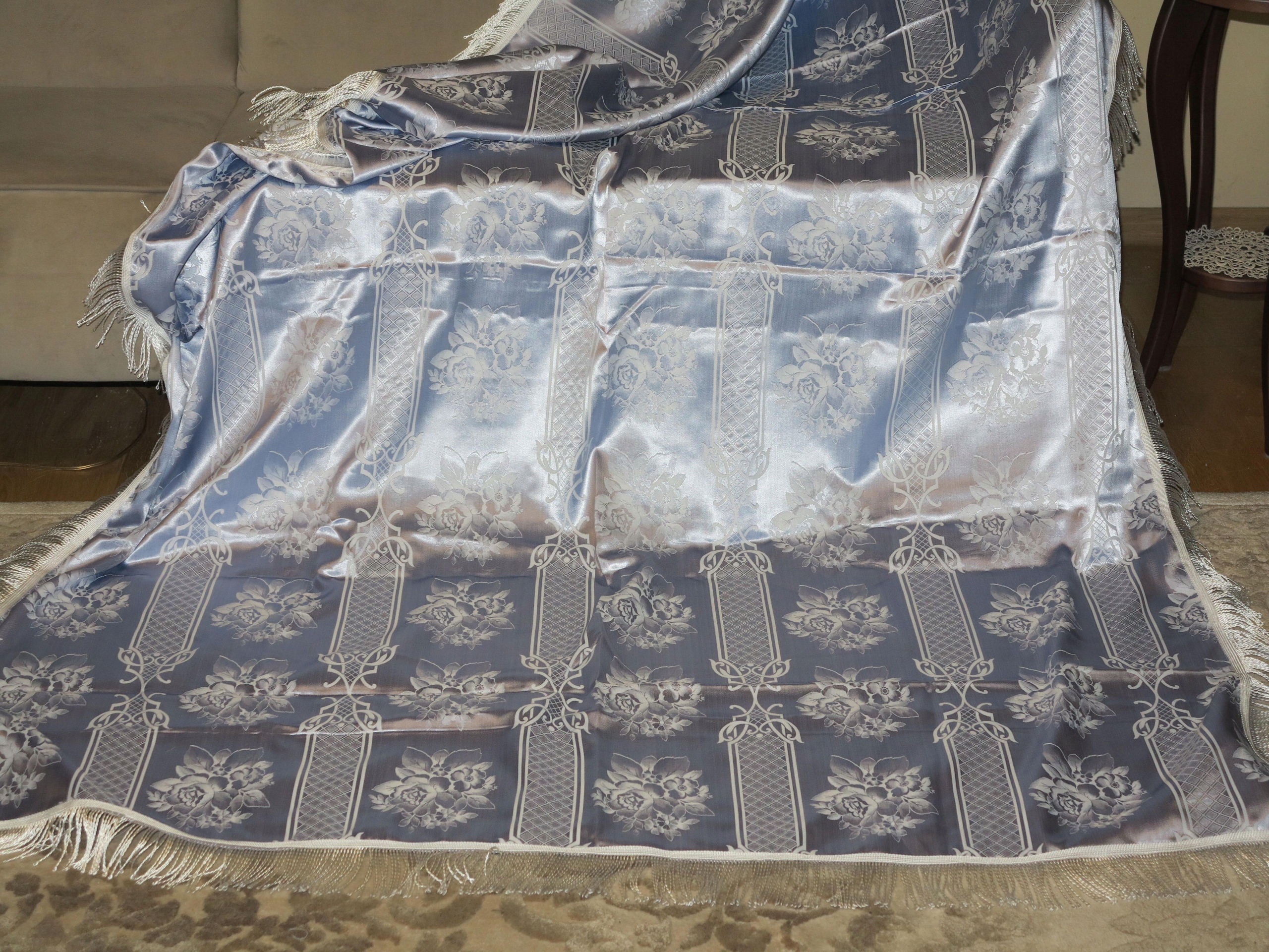Предмет на аукціоні надзвичайно красива, синя скатертина з бавовняно-шовковим штофом, зі стильними візерунками та трояндами. Скатертина має розміри: довжина 238 см, ширина 148 м + бахрома 7 см. Скатертина б/в, у відмінному стані. Рекомендую, буде гарною прикрасою столу. Рекомендую.