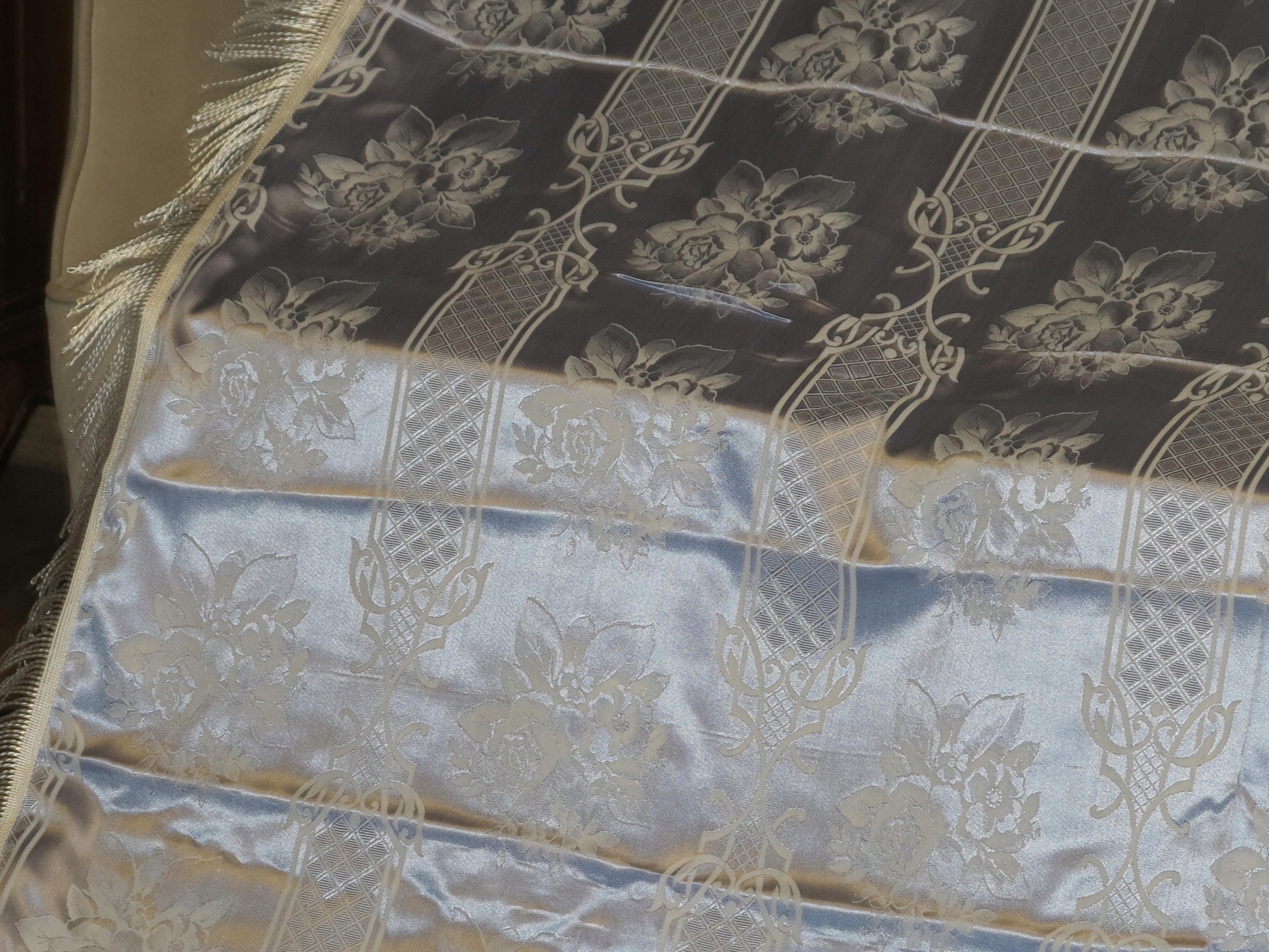 НАДЗВИЧАЙНО КРАСИВУ СОЦІЛЬНУ ВЕЛИЧЕЗНУ СКАТЕРТИНУ З ЩІЛЬНОГО СТИРУЩОГО БАВОВНИ ТА ШОВКУ ДАДАМАСКУ В КОЛЬОРІ СИНІЙ З МІНІМАЛЬНИМ ВІДТІНКОМ ЛАЙЛОВОГО З ВИЗІЛКУВАННЯМ І ТРОЯНДИ НА СТУБРІ. СКАТЕРТИНА НАВКОЛІ, ПРИКРАШЕНА ДОВГИМИ ПЕРЛИНИМИ.