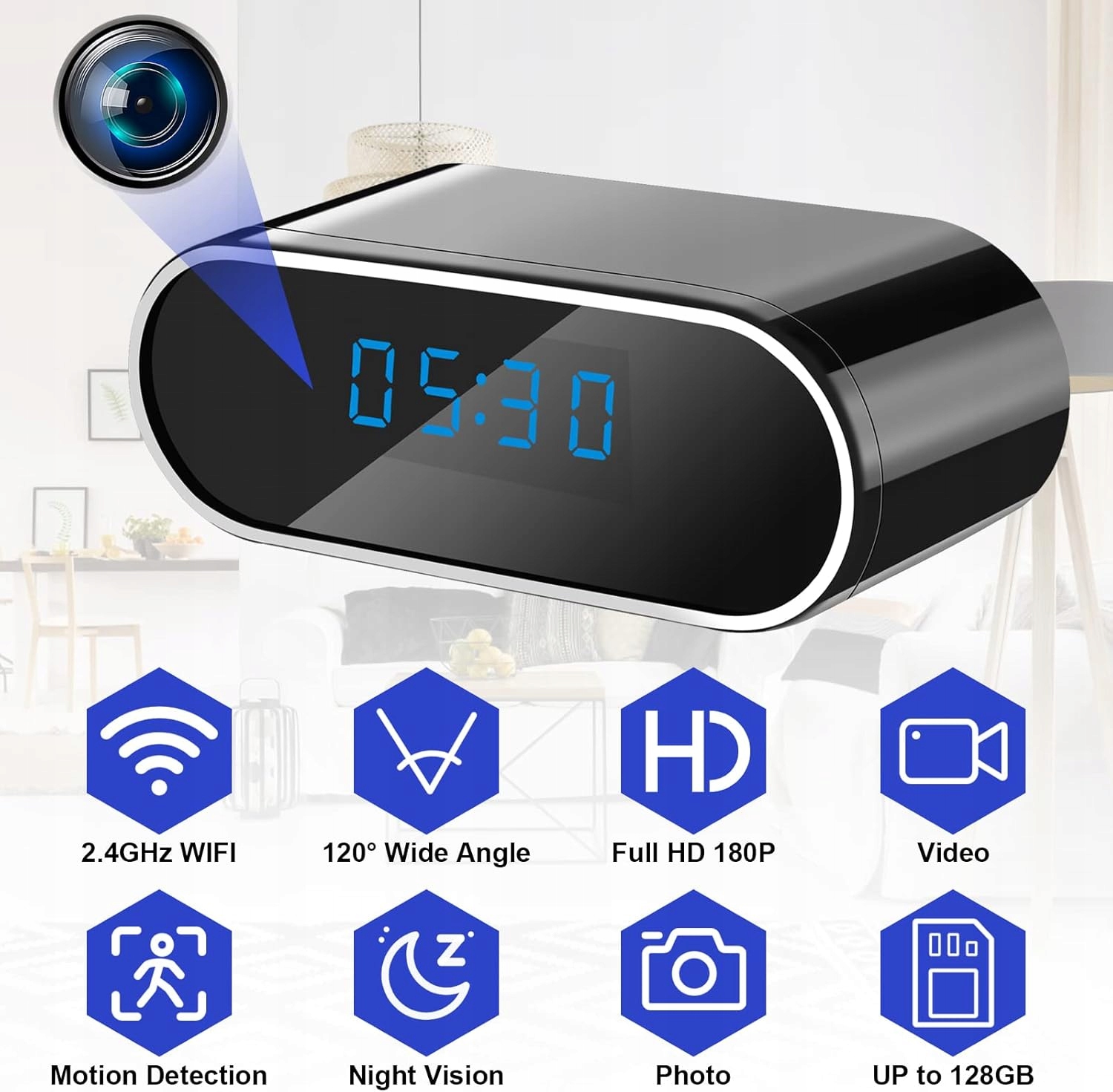 Панорамне зображення дозволить вам легко побачити все, що відбувається всередині або поза вашим домом. Вбудована камера в будильнику також може бути використана для моніторингу немовлят.