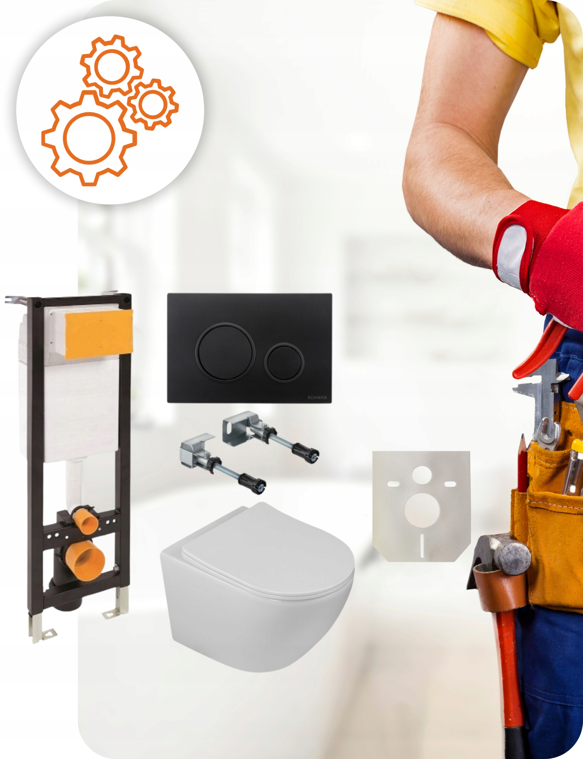 Набір туалетів 7в1 - це повне рішення для сучасної ванної кімнати. Каркас SLIM, підвісна миска DESNA, сидіння, що повільно закривається, і елегантна кнопка - гарантія комфорту та гігієни. Ідеально підходить для людей, які цінують функціональність і економію місця.