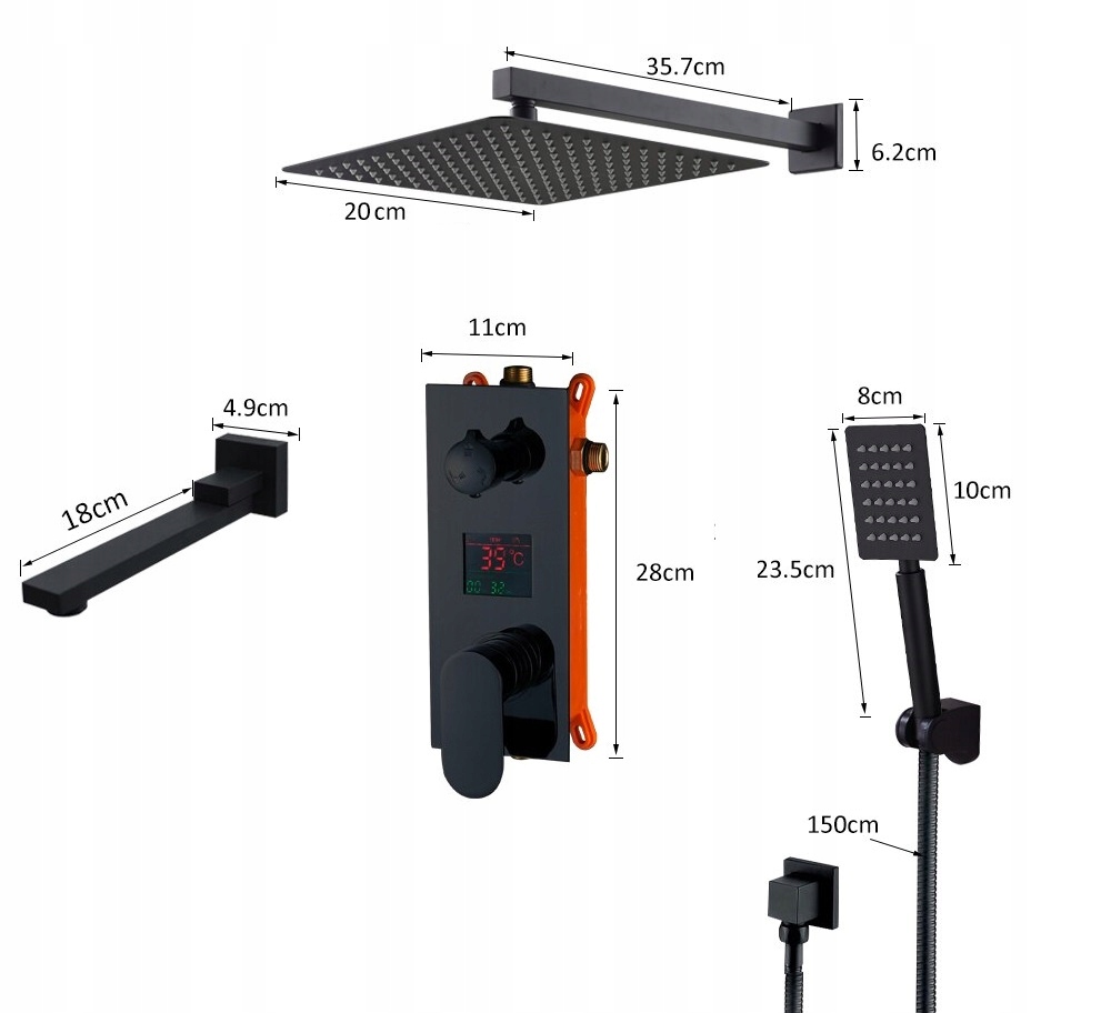 Прихований душ SET Чорний Вилив 30см