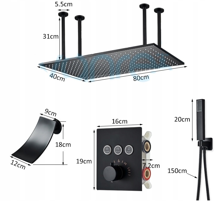Прихований душовий набір із термостатом Чорний душ для ванної кімнати