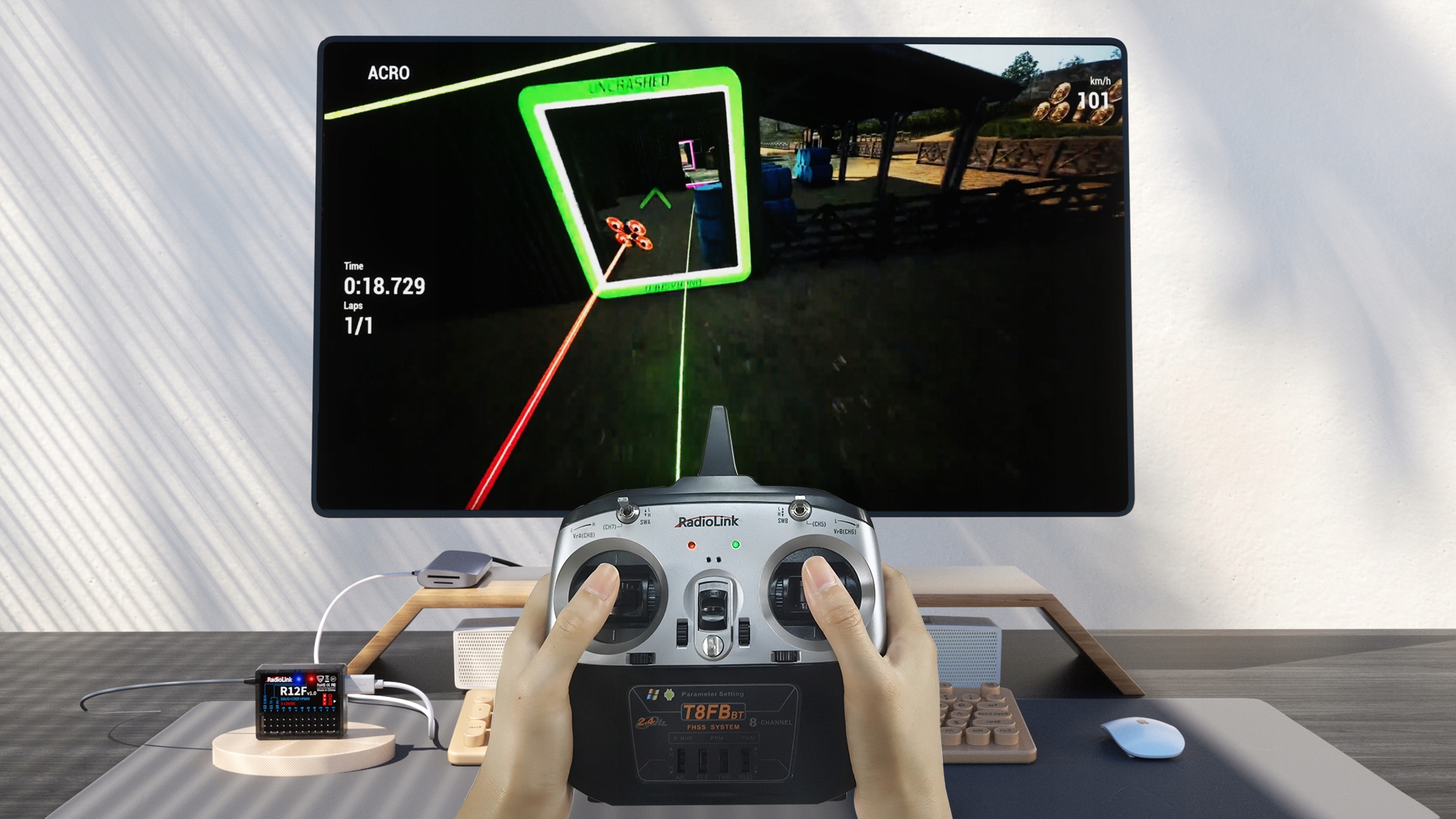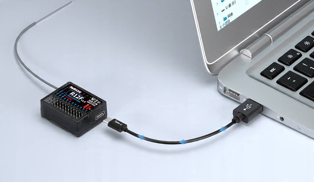 R12F оснащено вбудованою програмою для зв’язку з джойстиком ПК (потрібно оновлення мікропрограми до версії 1.6), тому він підтримує найновіші симулятори при безпосередньому підключенні до комп’ютера через порт Type-C, такі як TRYP FPV, AeroFly, Uncrashed, Liftoff, FPV LOGIC, Velocidrone (Black Sheep Simulator) та інші симулятори з відкритим кодом. Немає необхідності в додатковому живленні приймача. Його можна використовувати як на комп’ютерах Apple, так і на Windows. Сумісні передавачі: T16D / T12D / T8FB / T8S / RC8X / RC4GS V2 / RC4GS V3 / RC6GS V2 / RC6GS V3