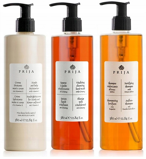 Набір косметики PRIJA, багатий усіма мінералами та вітамінами, які потрібні вашому тілу та волоссю. Завдяки використанню рослинних екстрактів набір має регенеруючі та живильні властивості для волосся та шкіри. Регулярне використання засобу обмежує надмірне виділення шкірного сала та відновлює втомлену шкіру. Косметика ідеальна для елегантних готелів, спа-салонів і апартаментів.