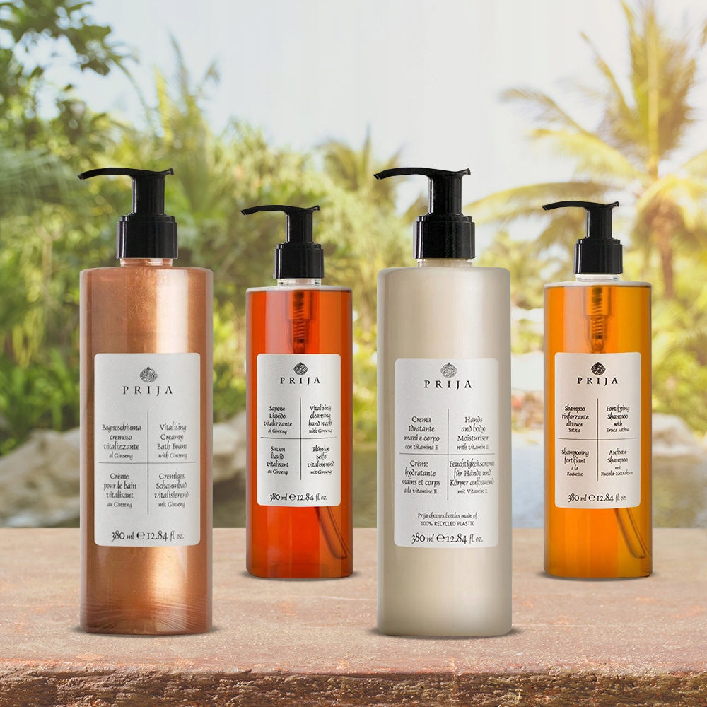 Набір косметики PRIJA, багатий усіма мінералами та вітамінами, які потрібні вашому тілу та волоссю. Завдяки використанню рослинних екстрактів набір має регенеруючі та живильні властивості для волосся та шкіри. Регулярне використання засобу обмежує надмірне виділення шкірного сала та відновлює втомлену шкіру. Косметика ідеальна для елегантних готелів, спа-салонів і апартаментів.