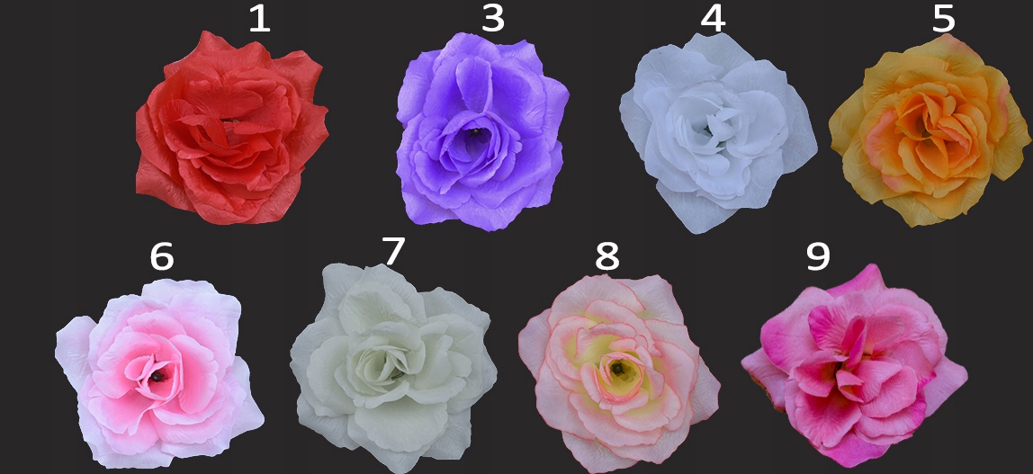 1. червоний, 3. фіолетовий 4. білий, 5. помаранчевий, 6. ніжно-рожевий, 7. світлий екрю (кремовий), 8. вершково-рожевий, 9. відтінковий рожевий