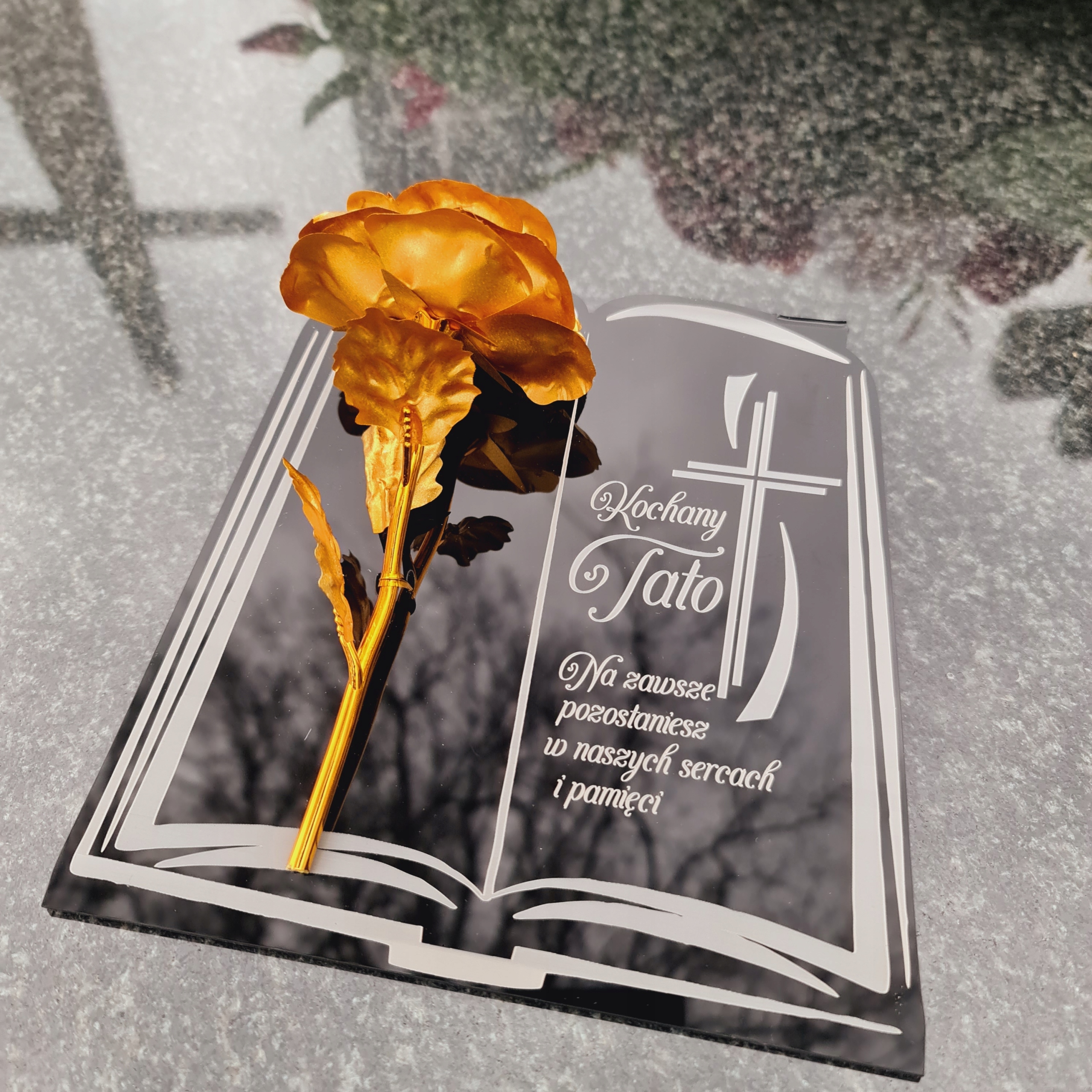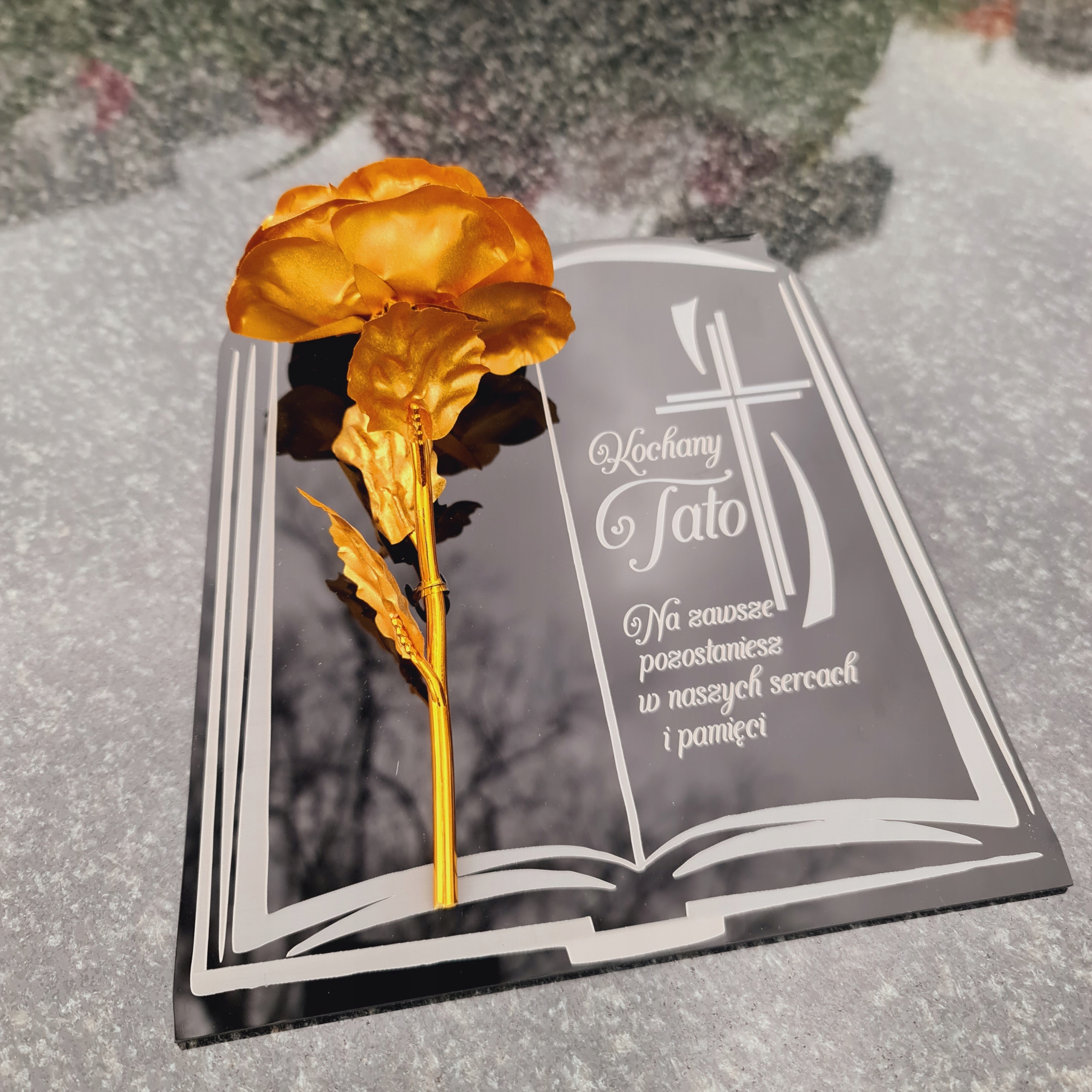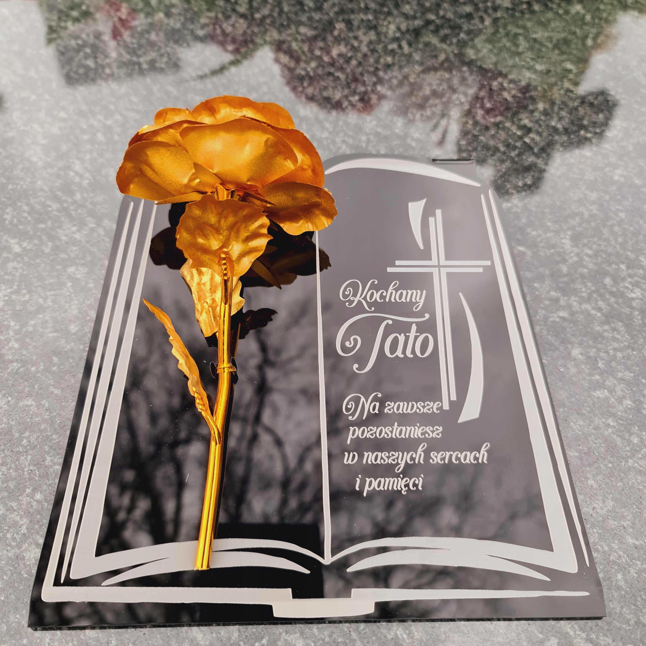 Золота троянда на п’єдесталі з гравюром для тато