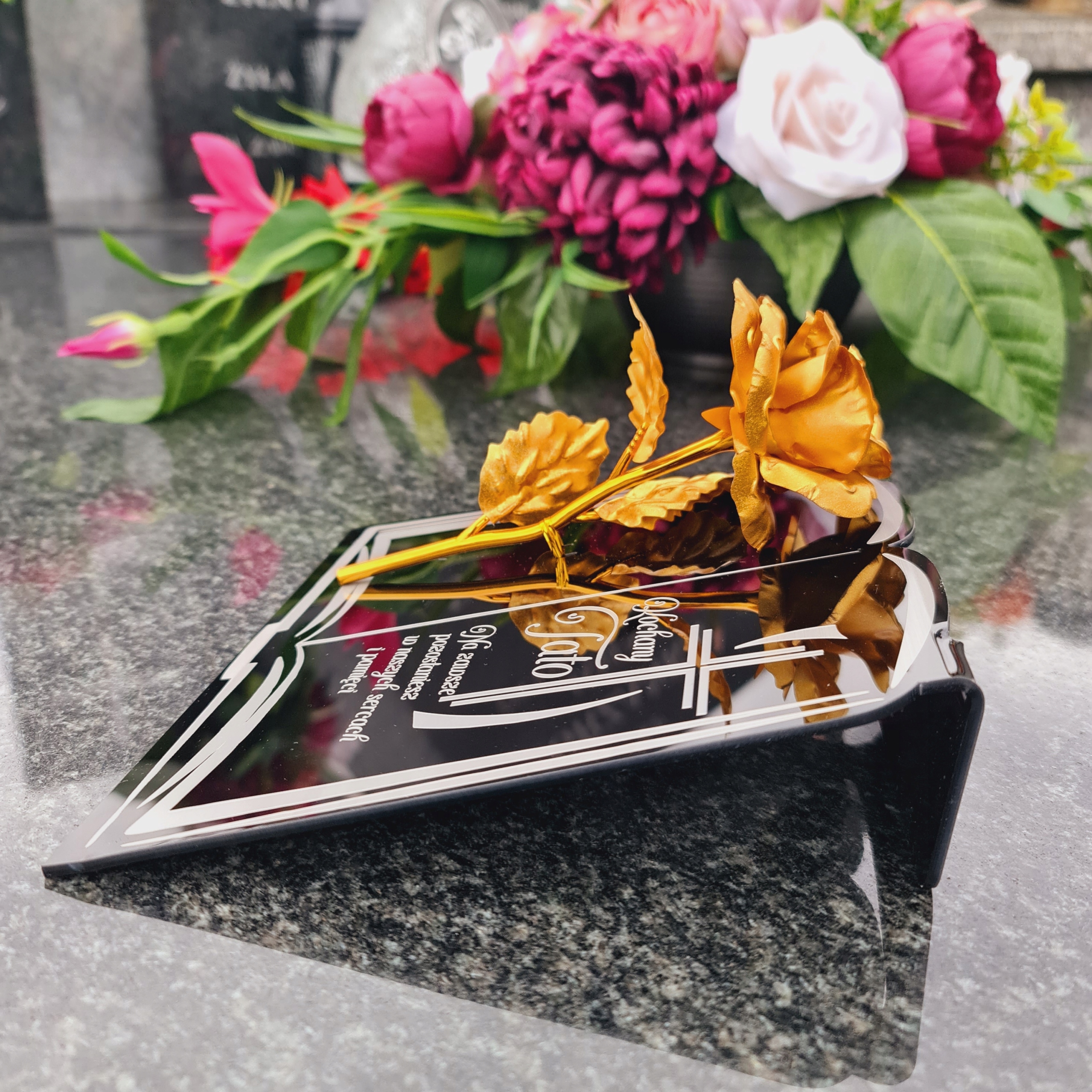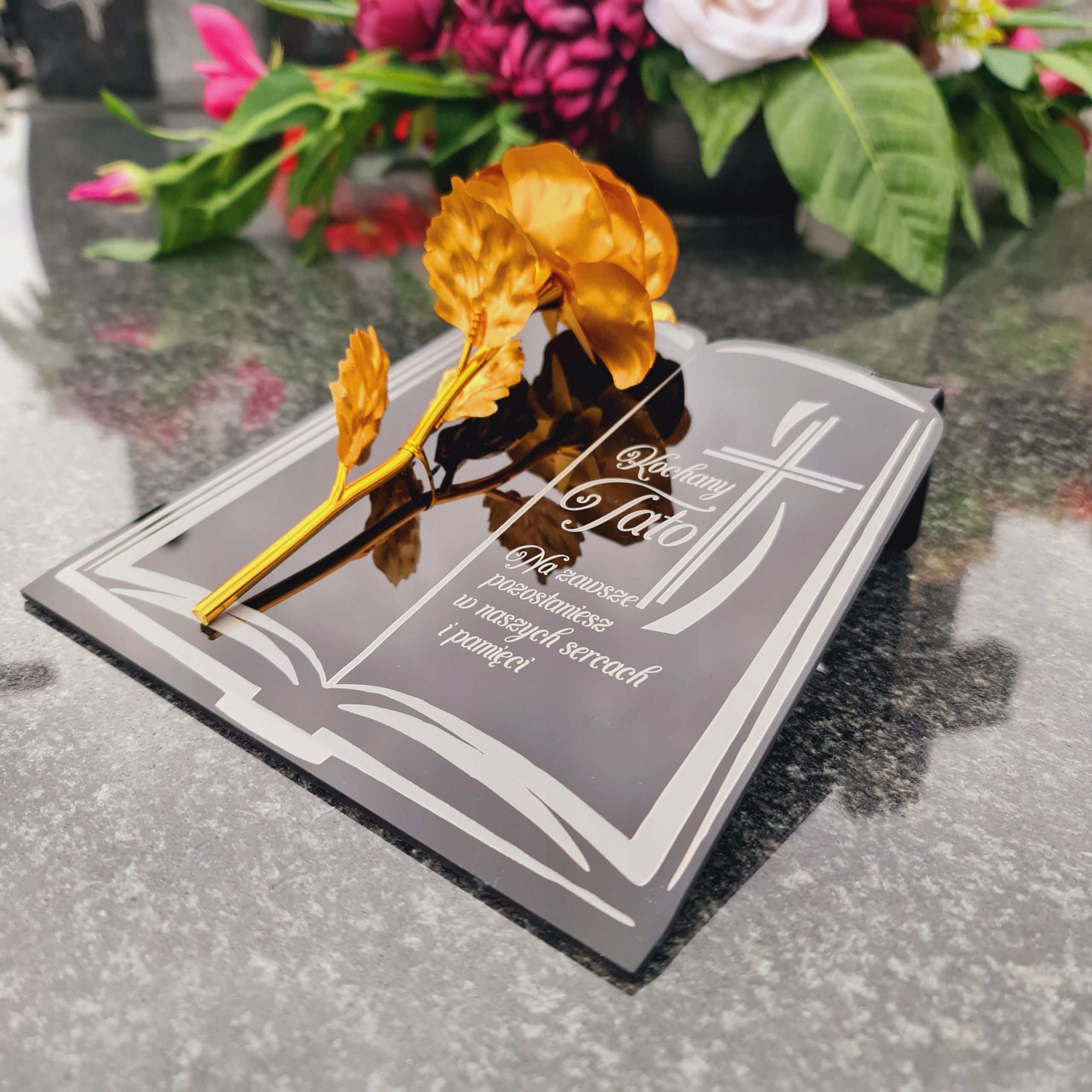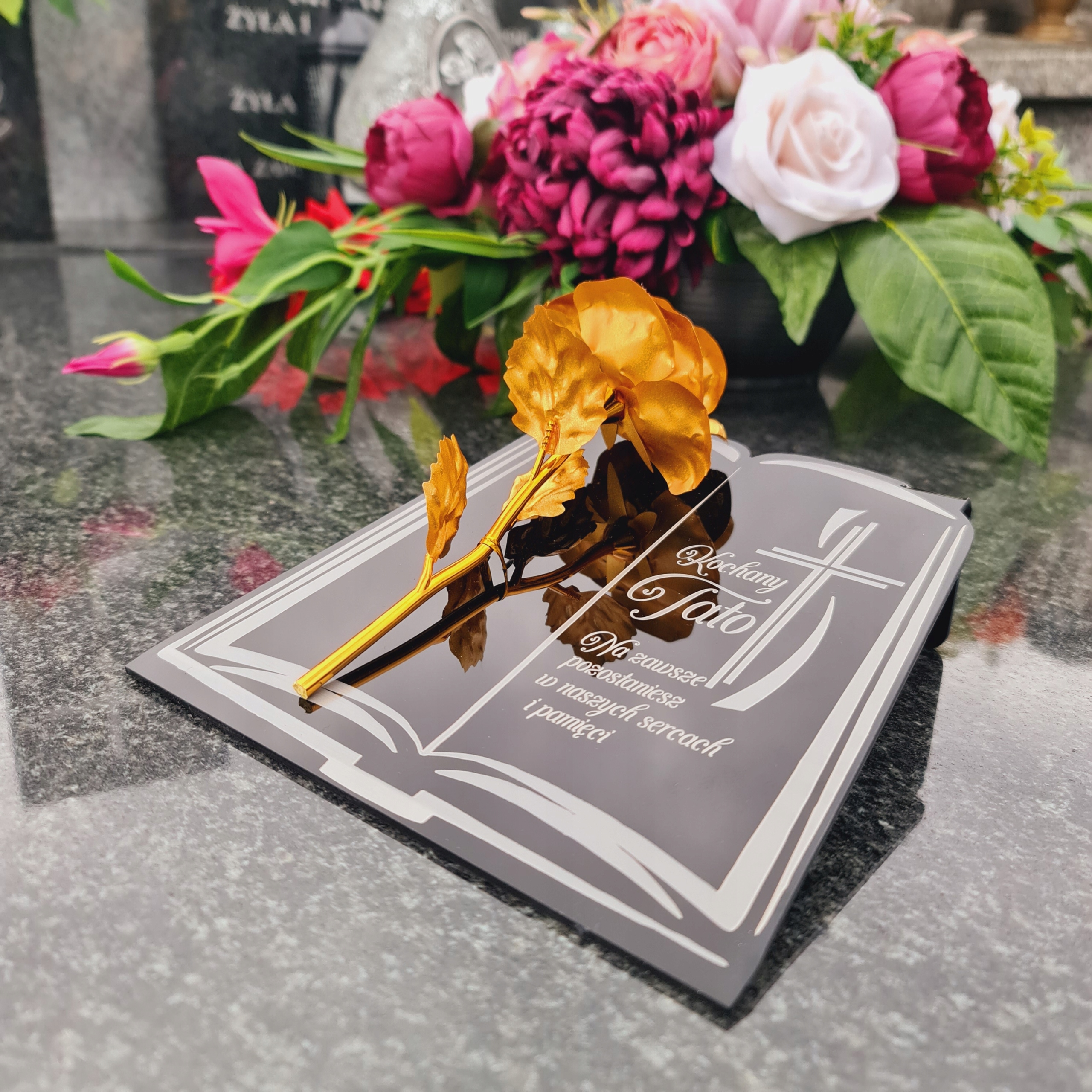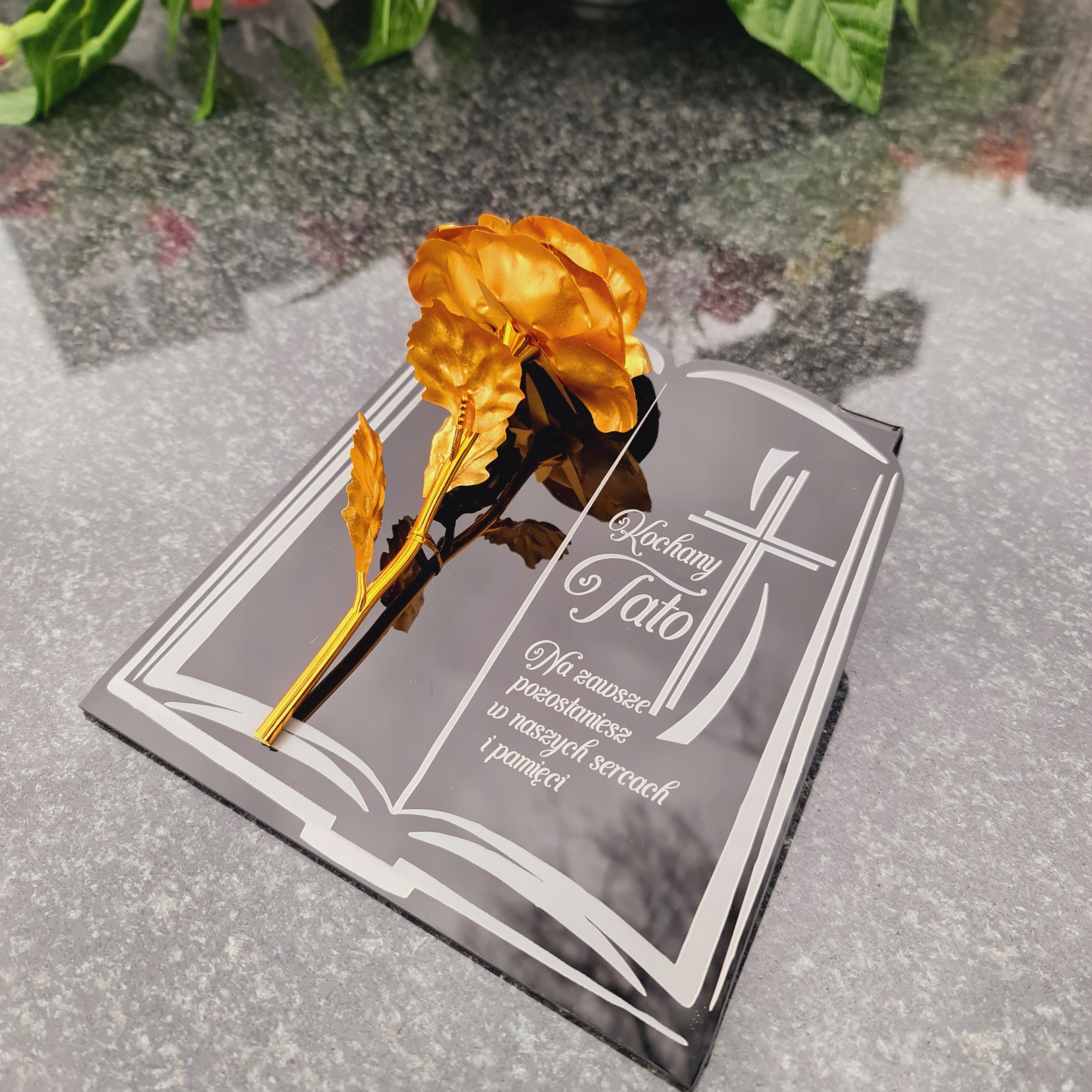 Золота троянда на п’єдесталі з гравюром для тато